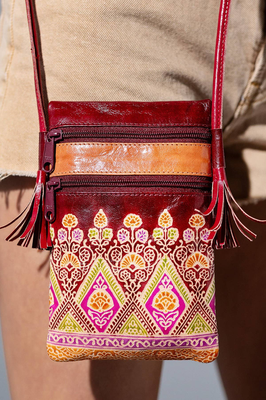 Add a touch of artistry to your daily style with the Maya Crossbody Bag. Crafted from genuine hand-painted leather, this cellphone bag features a unique ethnic motif and charming tassel accents. Practical and stylish, it's the perfect accessory for carrying your essentials with ease. Made in India.