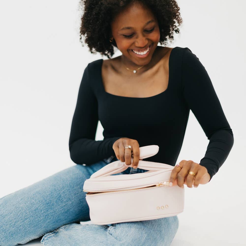 Introducing your new BFF - our Madelyn Bow Makeup Bag! Available in 4 chic colors, this makeup bag has plenty of room for all your beauty products, hair essentials, and more. Plus, there's a zipper pocket with a compact mirror for on-the-go touch-ups. Perfect for stylish travelers and it's easy to clean too! The Madelyn Bow Makeup Bag is another addition to our 3 Sisters Collection! This collection is inspired by the unbreakable bond shared between the owner/founder of Pretty Simple and her 2 sisters. These bags are marked with three signature studs and will complete outfits, catch eyes, and remind wearers of the incredible connection to their own sisters, whether through blood or by choice. You can see it in our inspiration and mission.
