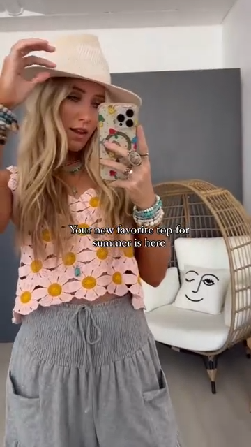 Boho-Chic Crochet Sunflower Top. Embrace the summer vibe with our Bohemian-style, crochet-knit sunflower top. This sleeveless, textured blouse, available in pastel and vibrant hues, is a boutique must-have. Crafted with artisanal flair, it adds a vintage-inspired touch to any wardrobe.