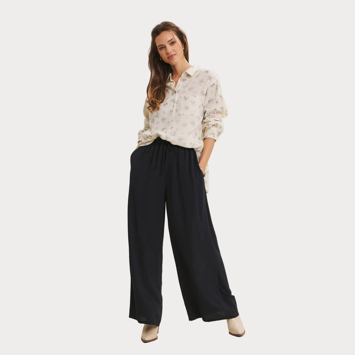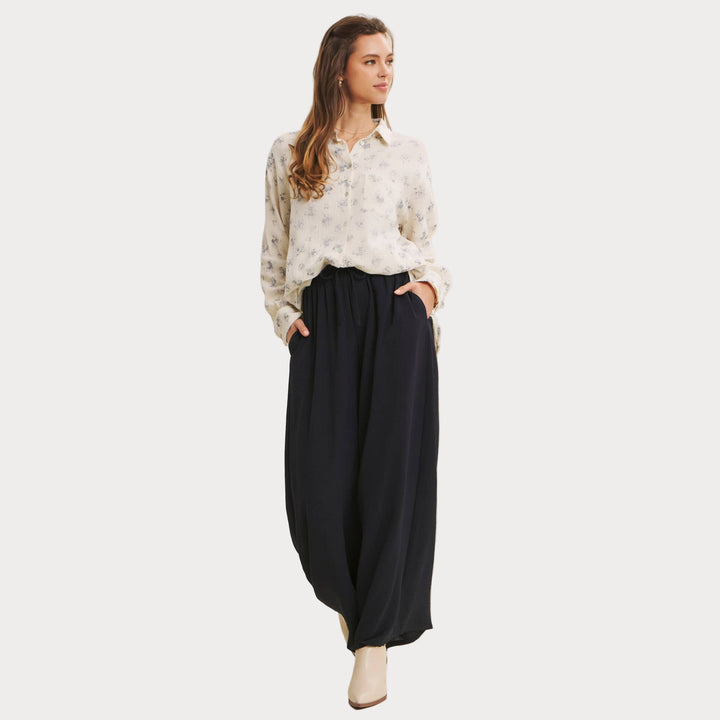 Woman wearing a white floral blouse and dark pants against a plain background