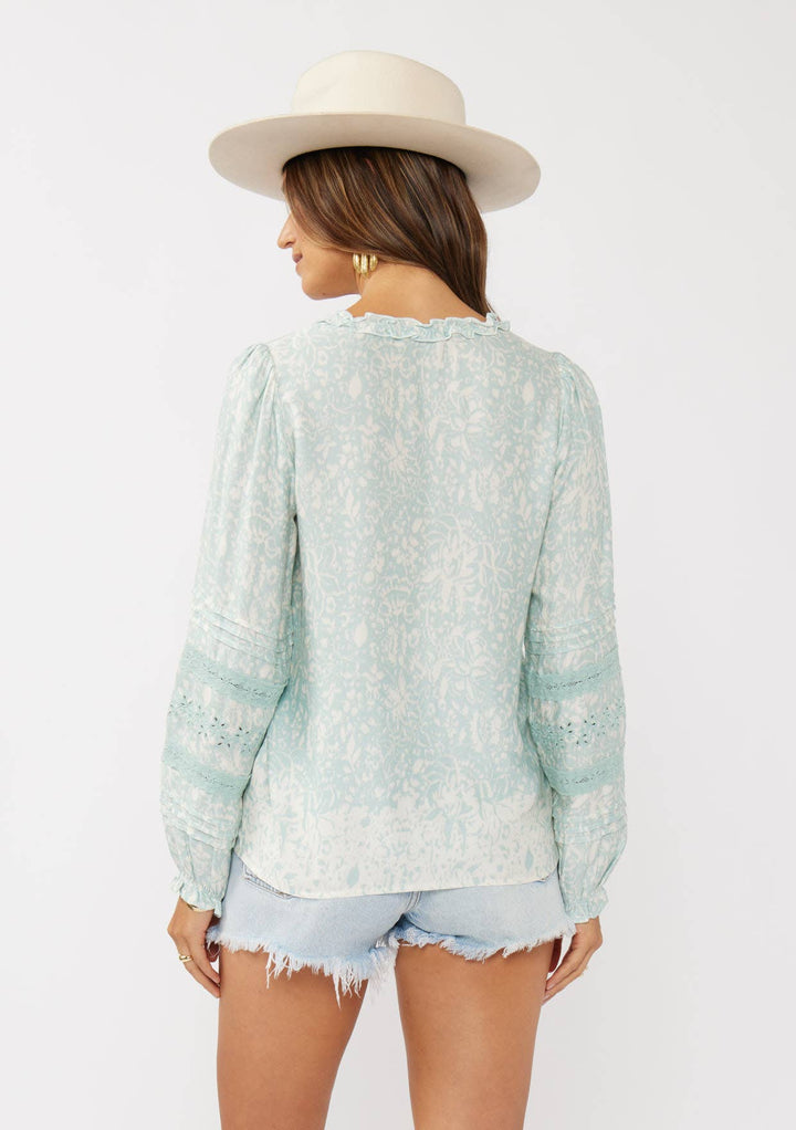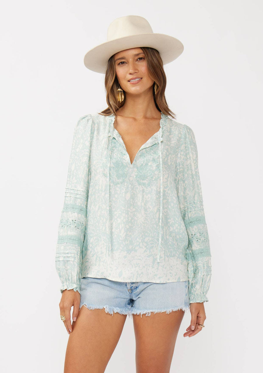 Elevate your style with our Floral Embroidered Lace-Trim Split Neck Blouse. Made from luxurious floral border satin challis, it boasts a split neckline with a flirty ruffle trim and spaghetti tie. Pintuck embroidery and scalloped lace sleeves add a touch of elegance, while elastic ruffle cuffs ensure comfort.