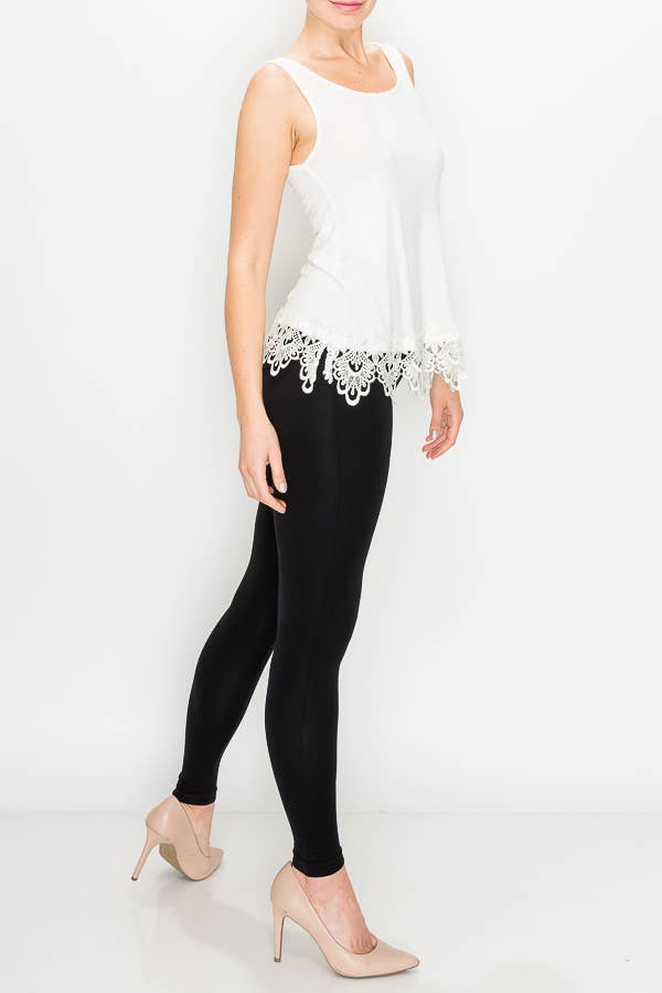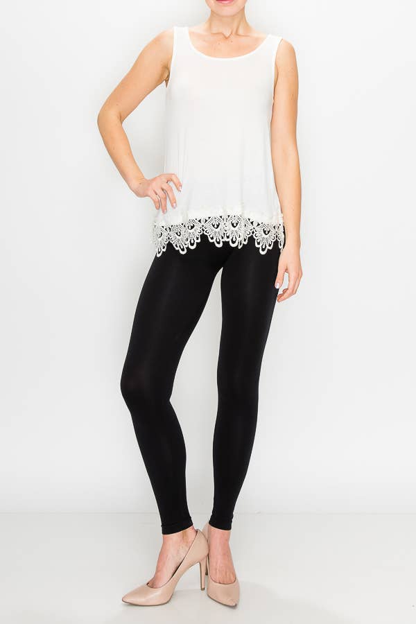 A model wears a sleeveless, scoop-neck tank top in ivory with a wide, intricate lace trim along the bottom hem. She is pairing it with black leggings and neutral-colored heels.