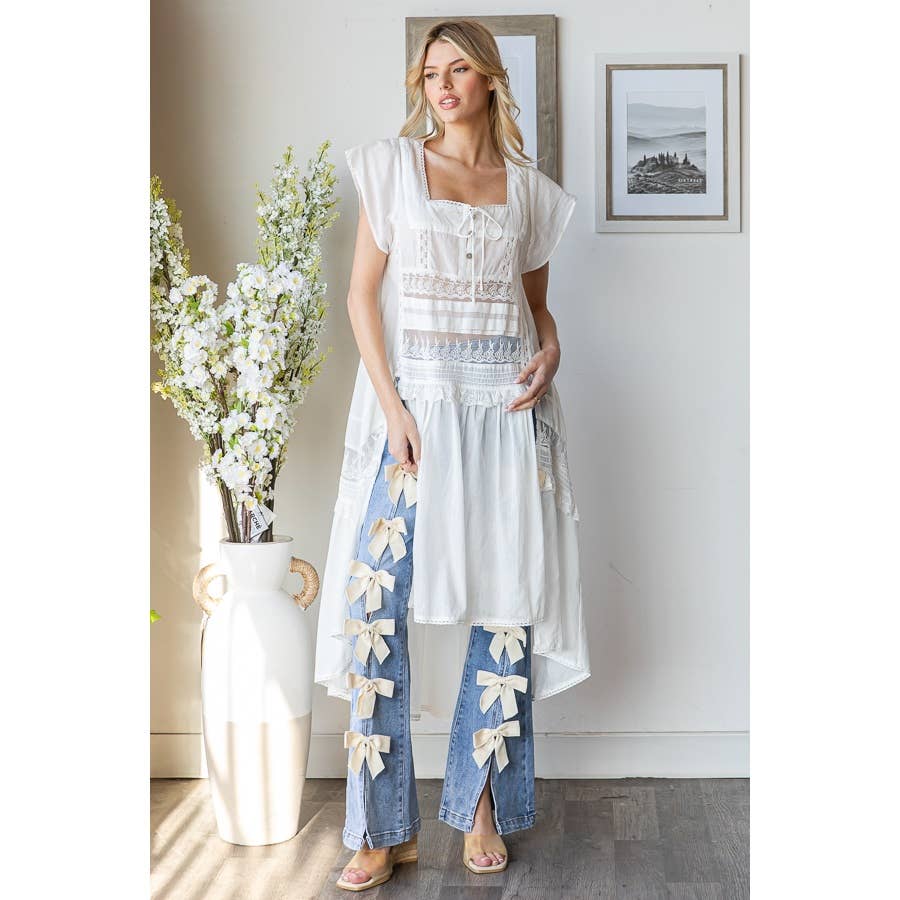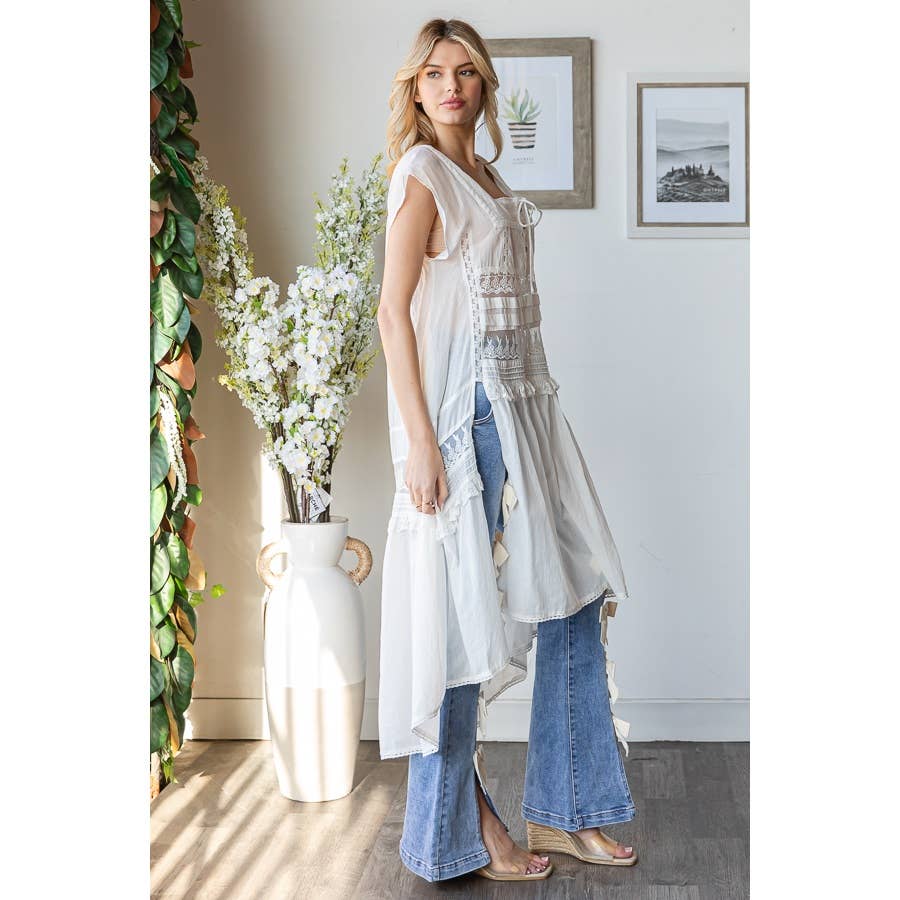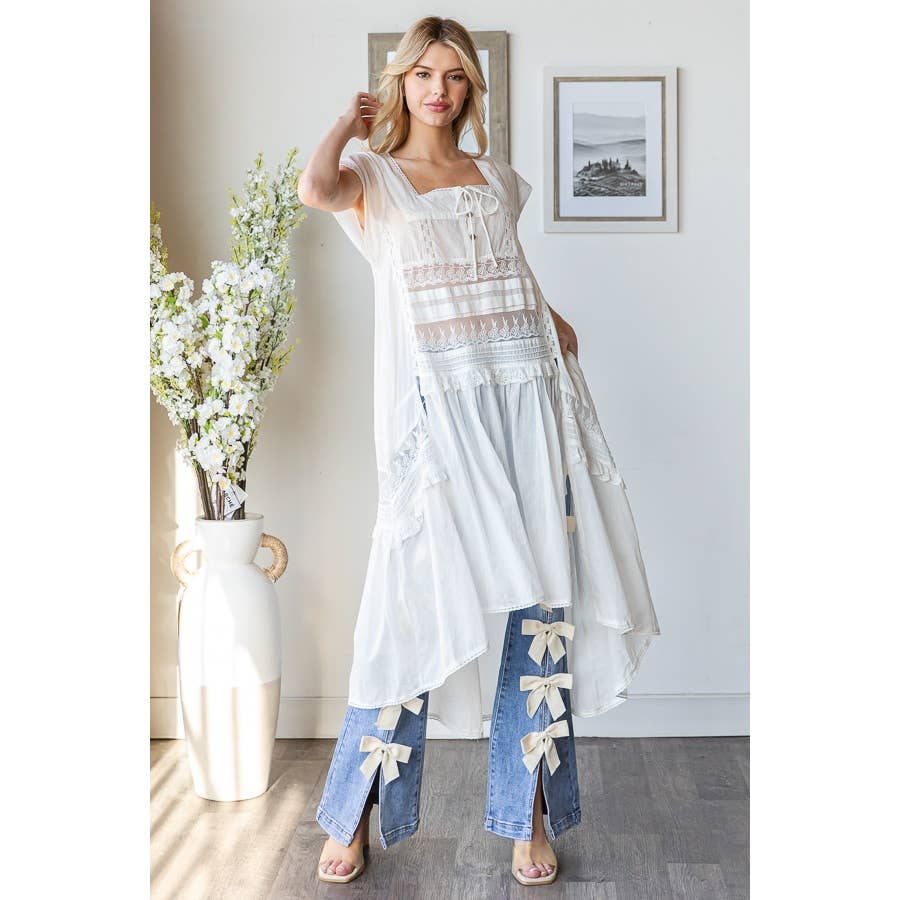 This playful maxi top features a flattering square neckline and delicate sheer lace trim that adds a touch of whimsy. The side slit offers ease of movement and a flirty silhouette, making it perfect for sunny days or casual evenings out. Lightweight and breezy, it’s a charming addition to your wardrobe that pairs effortlessly with your favorite jeans or shorts.