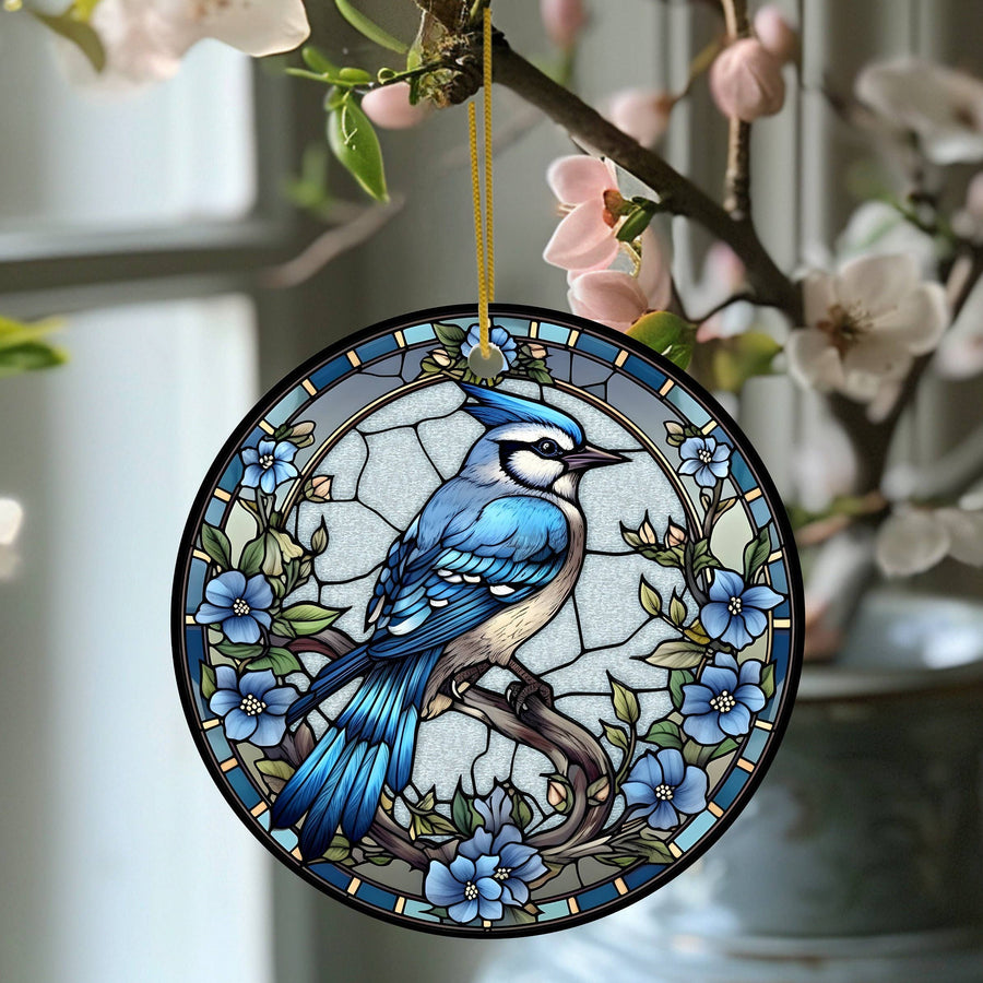 Elevate your holiday decor with the Bluejay Imitation Stained Glass Ceramic Ornament. This exquisite 3.0-inch disc showcases intricate artistry that beautifully captures the majestic bluejay. With its high gloss finish and pristine white edges, it adds elegance to your tree.