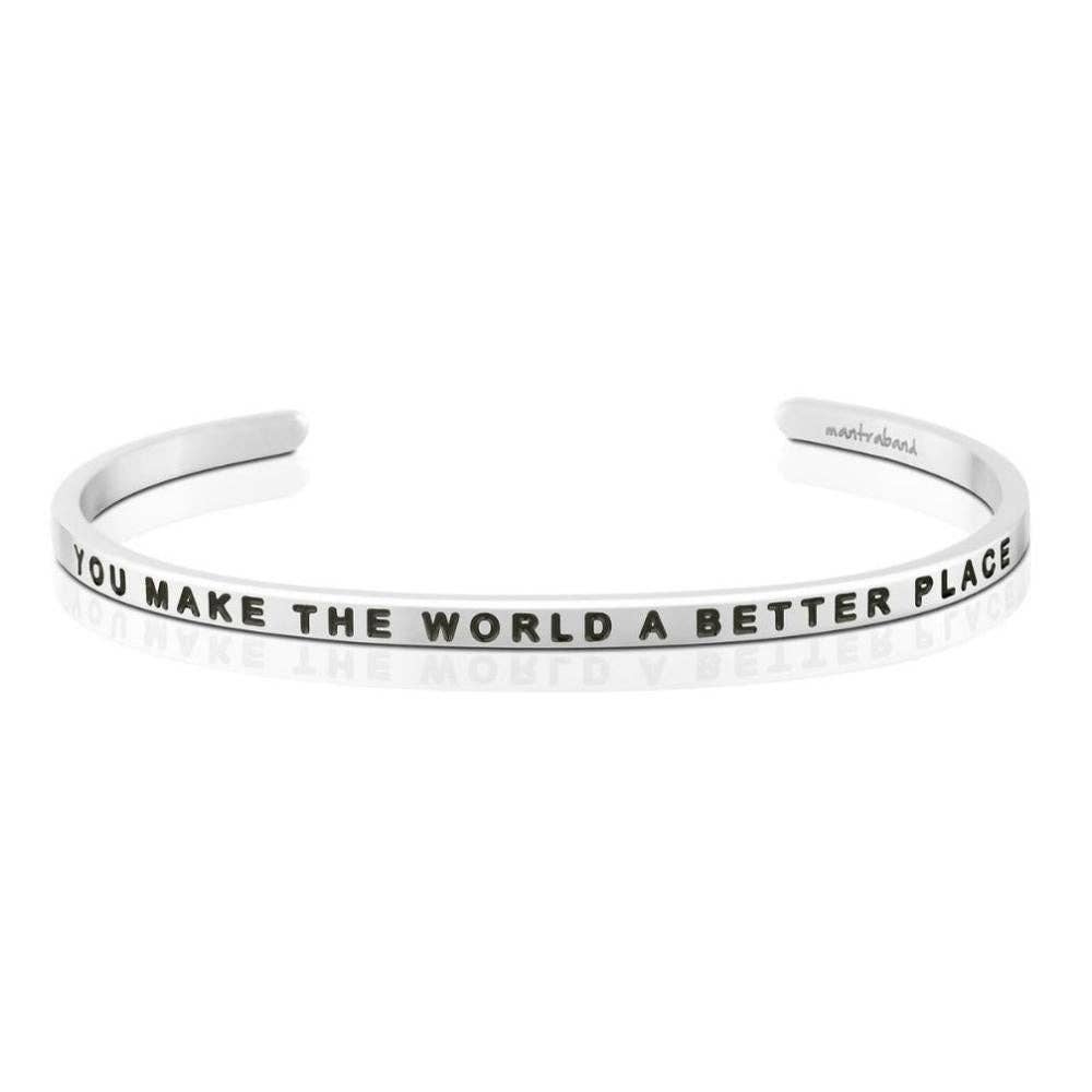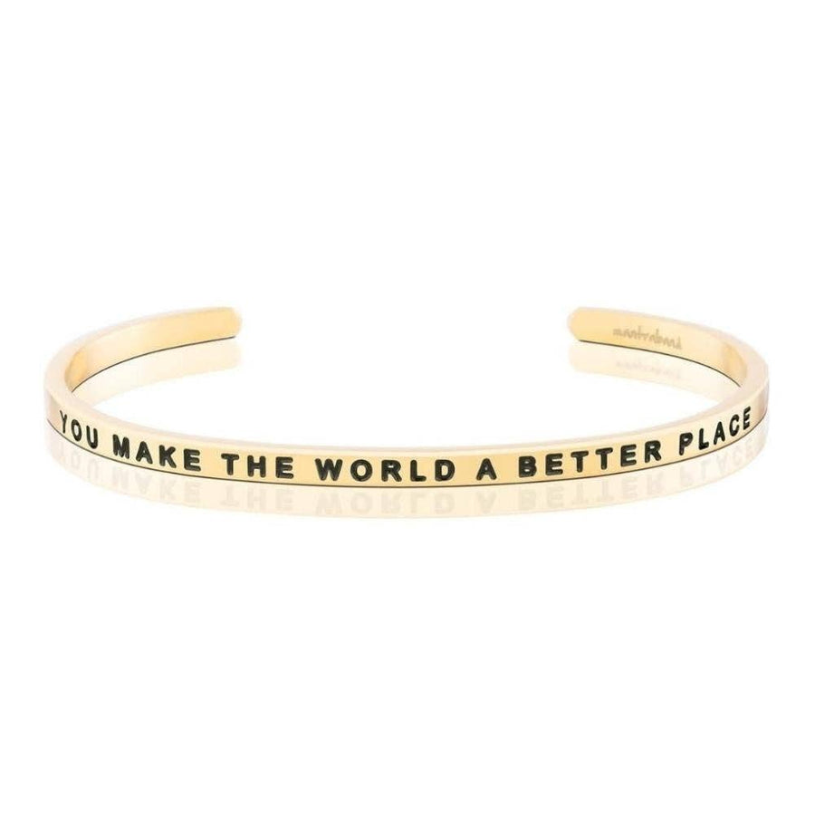 Celebrate your unique light with the You Make The World A Better Place bracelet. This fully adjustable piece serves as a constant reminder of your importance and the positive impact you have on those around you. Crafted from durable stainless steel, it's lead-free, nickel-free, and hypoallergenic, ensuring comfort and longevity. The gold and rose gold options are beautifully 18K gold dipped, adding a touch of elegance to your everyday style. Each bracelet is authentically made by MantraBand and comes with a lifetime guarantee against breakage, making it a lasting symbol of love, kindness, and inspiration. Shine bright and wear your mantra proudly.