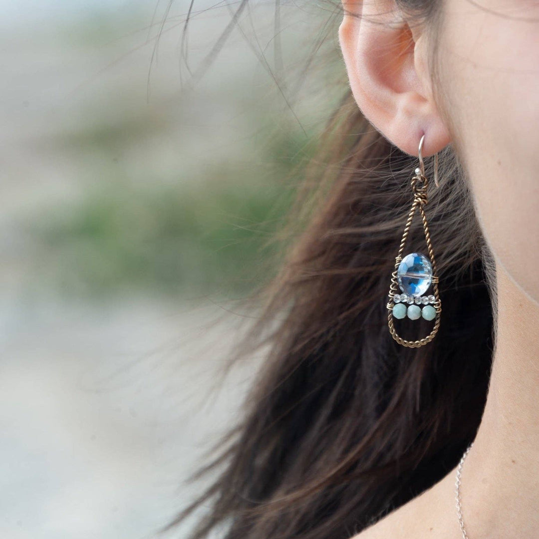 Handcrafted earrings with amazonite and blue quartz gemstones set in twisted brass drops with sterling silver hooks, made by Art by Any Means in Rockport, Massachusetts.
