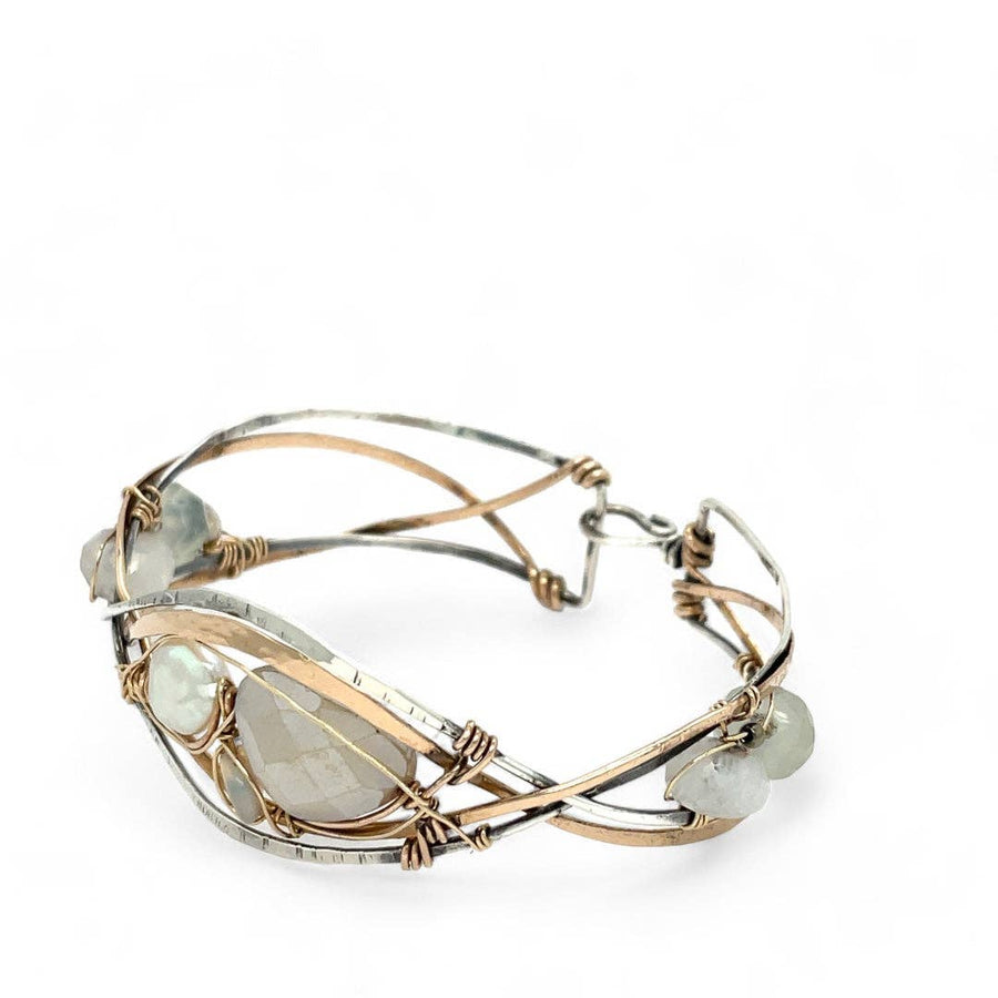 Introducing the Braided Moonstone Cuff Bracelet B405, a stunning piece handcrafted to perfection. Featuring a striking moonstone faceted nugget nestled among a delightful cluster of jade, fresh water pearl, and opal, this bracelet showcases the beauty of natural gemstones. Each stone is elegantly wrapped in gold fill and set within expertly crafted braids of bronze and oxidized sterling silver.