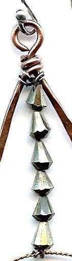 Handcrafted pyrite gemstone earrings with copper frame and oxidized sterling silver wire detail, designed by Art by Any Means in Rockport, Massachusetts.