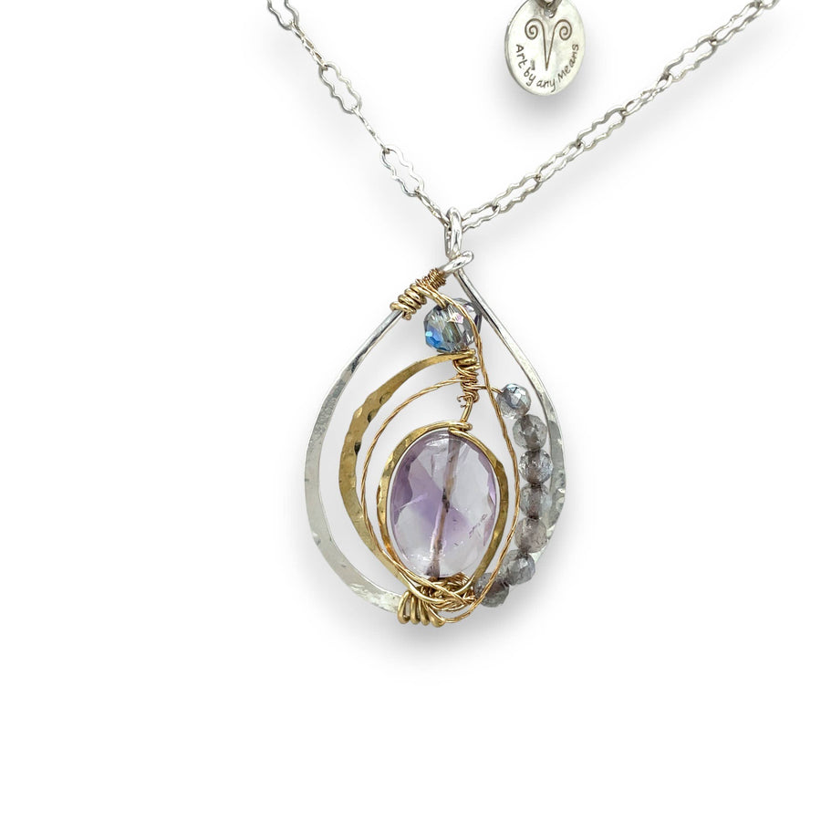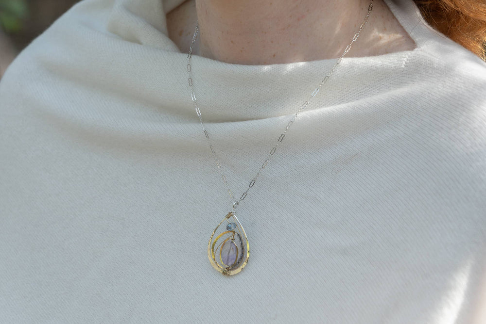 Elevate your style with the Lilac Amethyst Drop Necklace, featuring a stunning translucent amethyst gemstone expertly faceted for a brilliant shine. Accented with exquisite crystal and beautifully set in a hammered brass and sterling silver drop design, this necklace is the perfect addition to any outfit.