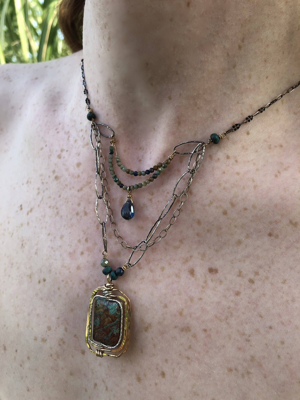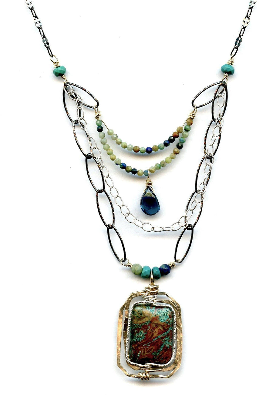 Discover the elegance of the London Blue Necklace, featuring an earthy chrysocolla gemstone beautifully accentuated by sparkling sterling silver and hammered bronze layers. This exquisite piece showcases a double row of green turquoise faceted spheres, elegantly suspending a stunning London blue Topaz drop wrapped in 14k gold filled. The necklace features patinated dark sparkle links and a textured sterling silver multi-chain, adjustable from 16 to 18 inches. Elevate your jewellery collection with this captivating accessory.