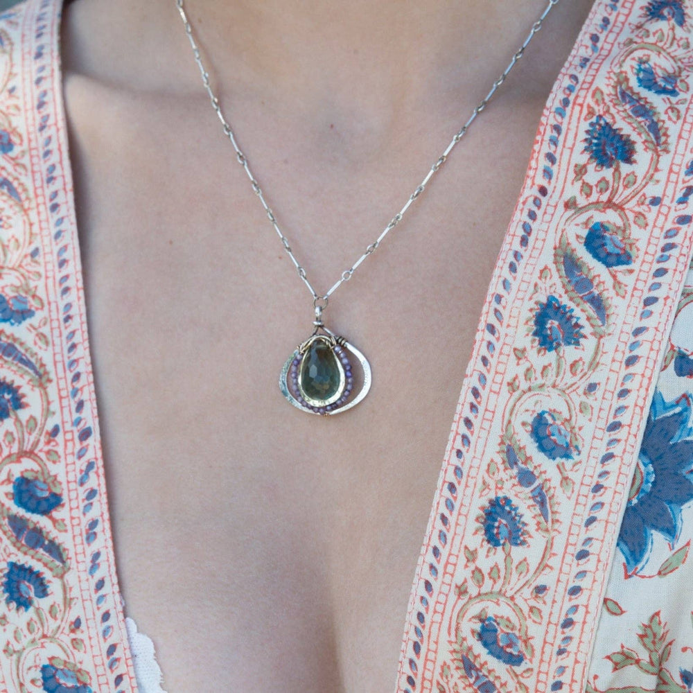 Discover the elegance of the Thistle Flower Necklace 83260N. This exquisite piece showcases a stunning green amethyst faceted tear drop gemstone, beautifully set in hammered brass. It is delicately outlined with micro faceted lavender cubic zirconia gemstones, all framed within a handmade sterling silver Thistle pendant.