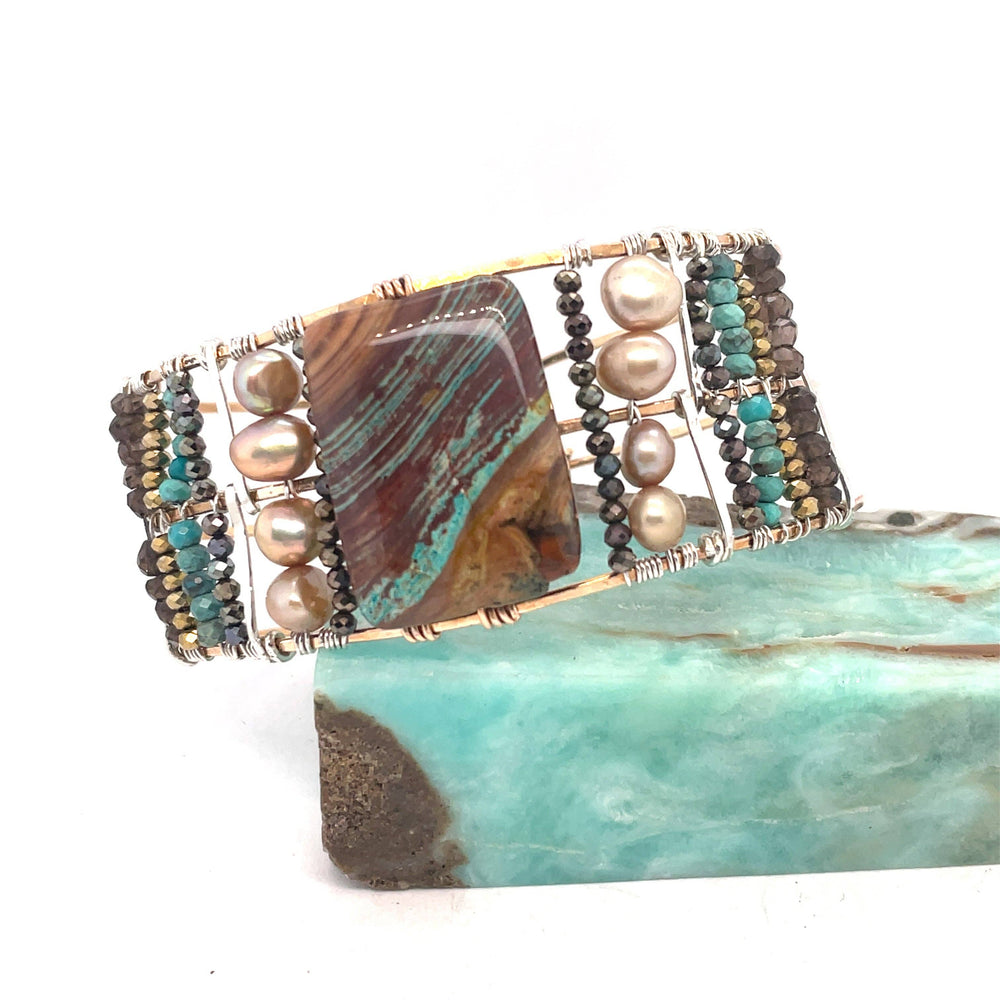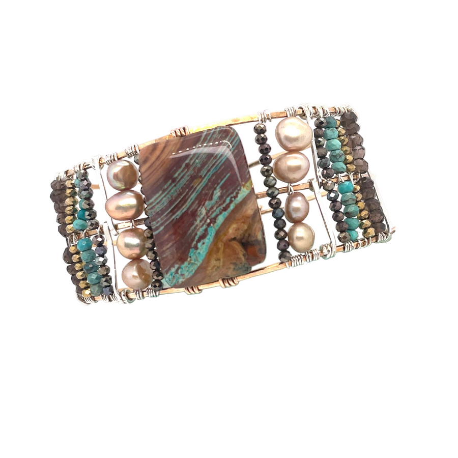 Discover the Wild West Wide Cuff Bracelet, a stunning piece that beautifully blends natural materials and artistry. Featuring a striped jasper smooth stone slab, the bracelet is accented with champagne freshwater pearls, micro-faceted pyrite, smoky quartz, and turquoise gemstones all meticulously strung on sterling silver. Its hammered bronze design adds a unique touch, making it an eye-catching accessory.