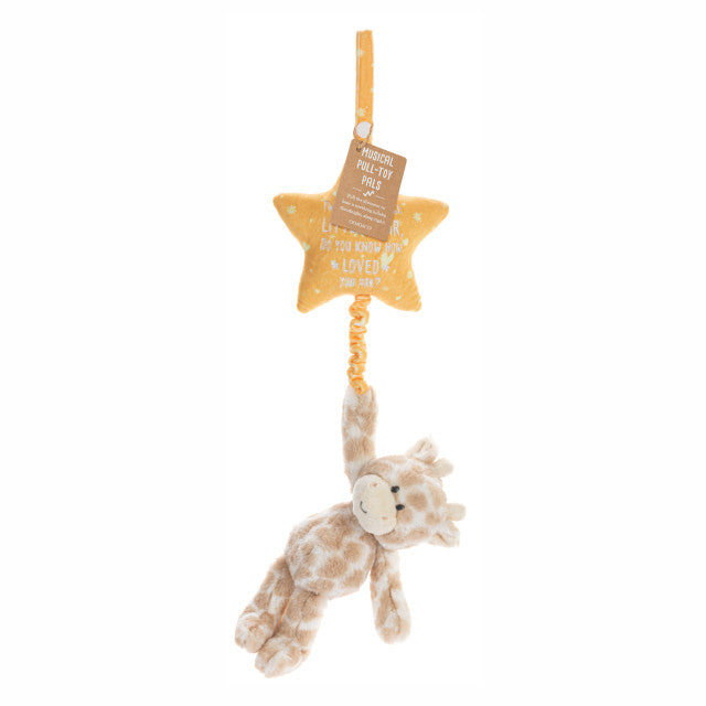 Measuring 6" wide and 22" long (+8.5" extension), it's made with musical plastic and polyester fiber for durability. The heartfelt embroidered sentiment, "Twinkle twinkle little star, Do you know how loved you are?" adds a special touch. Ideal for everyday use and surface washable for easy care. This charming giraffe is the perfect gift for any occasion!