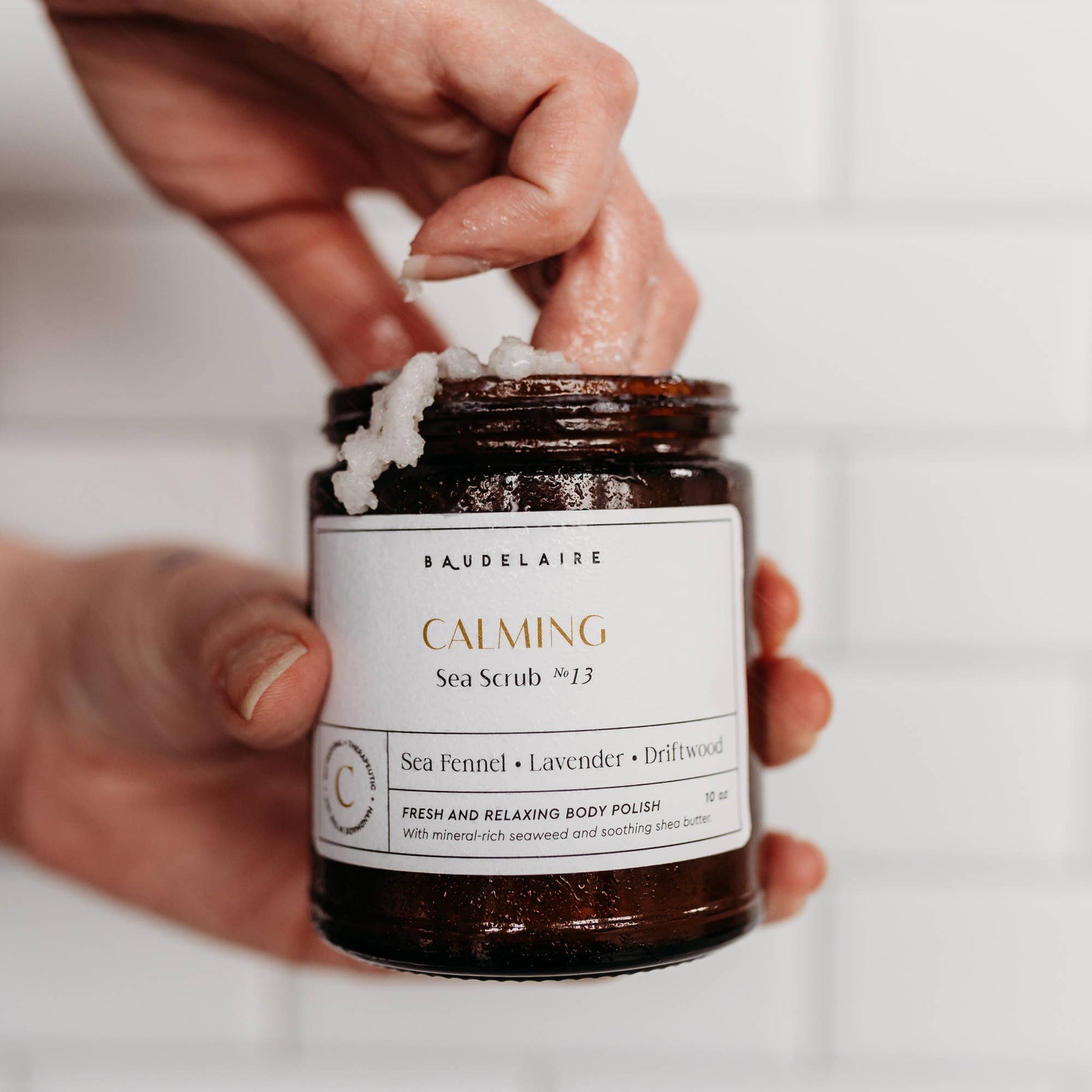 amber jar labeled calming sea scrub with lavender sea fennel driftwood