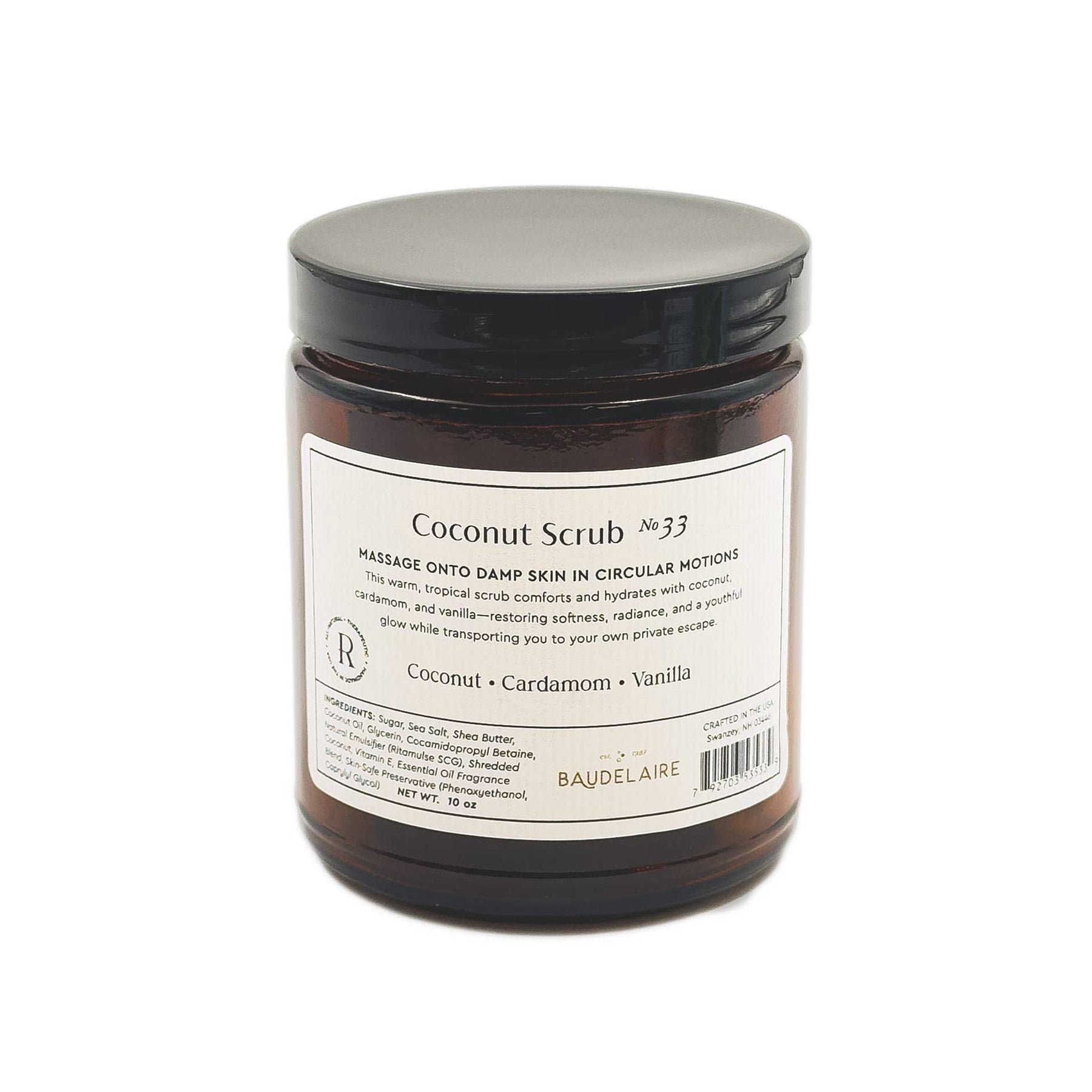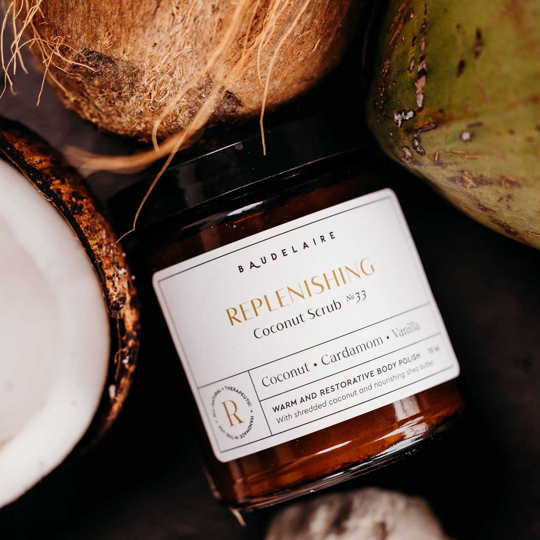 amber jar labeled replenishing coconut scrub with coconut cardamom vanilla scent