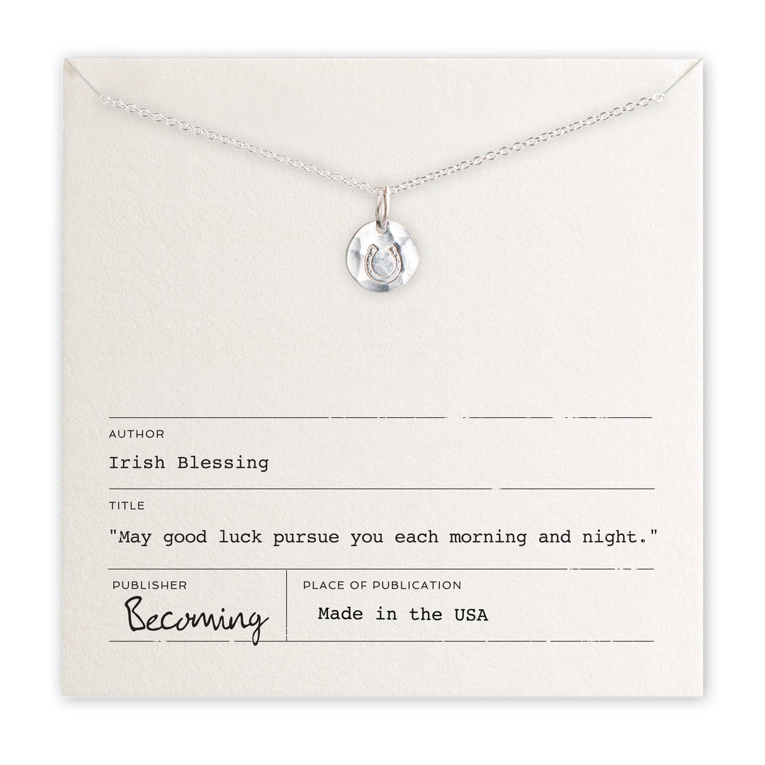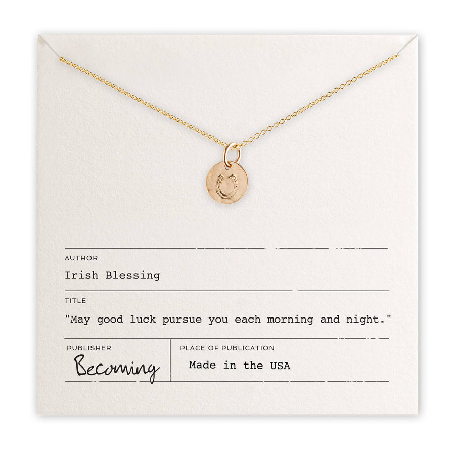 Embrace good fortune with our Horseshoe Necklace, a beautiful embodiment of luck inspired by an Irish blessing. Featuring a delicate 3/8" horseshoe charm, this piece is designed for every day, hanging gracefully from an 18" fine cable chain. Choose between sterling silver and gold filled metals to complement your unique style. Each necklace comes thoughtfully packaged on a message card, nestled in a charming jewelry box, making it a perfect gift for loved ones or a special treat for yourself. Let luck be your companion from morning to night.