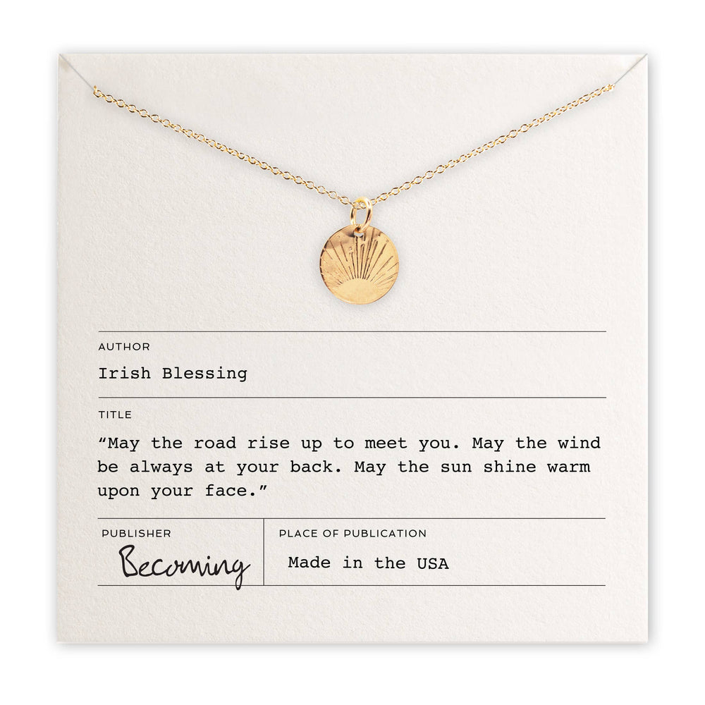 Embrace the essence of tradition with the Irish Blessing Necklace. Featuring a delicate 1/2" sun charm, this necklace carries the heartfelt wishes: May the road rise up to meet you, and may the wind be always at your back.