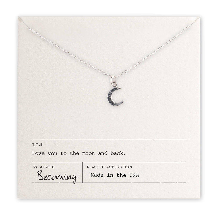 Embrace the sentiment of limitless love with the Love You To The Moon Necklace. This exquisite piece features a delicate moon charm, measuring 3/8", on an 18" fine cable chain. Available in sterling silver or gold filled with a gold vermeil charm, it is perfect for expressing affection. The necklace arrives beautifully packaged with a heartfelt message card and jewelry box, making it an ideal gift for someone special. Wear it as a reminder that love knows no bounds.