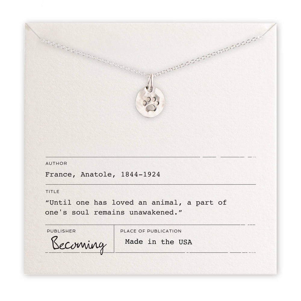 Celebrate your love for animals with the exquisite Paw Print Necklace. Crafted with a delicate 3/8" paw print charm, this piece hangs gracefully on an 18" fine cable chain. Available in both sterling silver and gold filled, it serves as a beautiful reminder of the bond you share with your cherished pets. Each necklace comes elegantly packaged with a heartfelt message on a necklace card, all nestled in a charming jewelry box. A perfect gift for any animal lover.