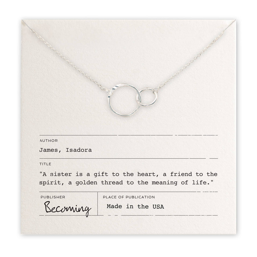 Celebrate the unique bond of sisterhood with our Sisters Necklace. Featuring large and small joined rings, this elegant charm measures 1" across and hangs from a delicate 16" fine cable chain. Available in both sterling silver and gold filled, it embodies the sentiment that a sister is a gift to the heart and a friend to the spirit. Each necklace is beautifully packaged with a heartfelt message on a necklace card, making it a perfect gift for your beloved sister.
