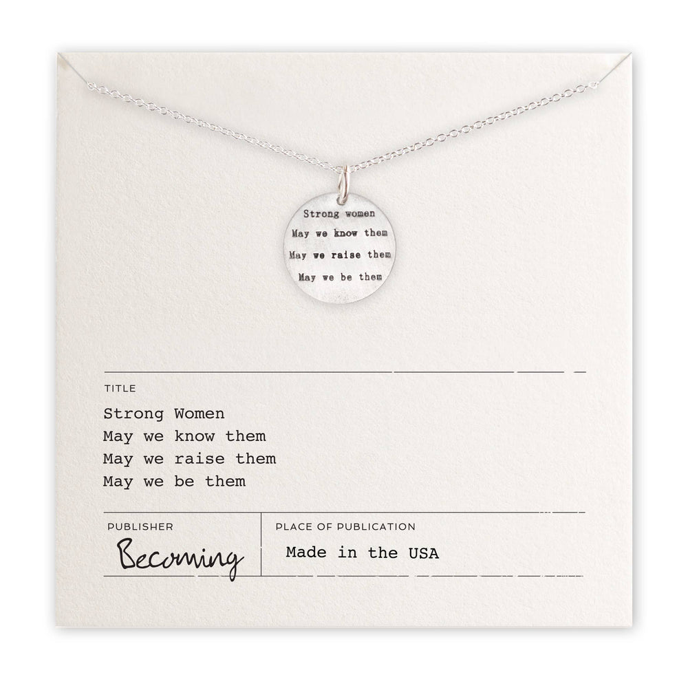 Celebrate strength and resilience with the Strong Women Necklace. This beautiful piece showcases an inspiring charm that reads: Strong women may we know them, may we raise them, may we be them. Crafted with care, the charm measures 5/8" and hangs elegantly from an 18" fine cable chain.