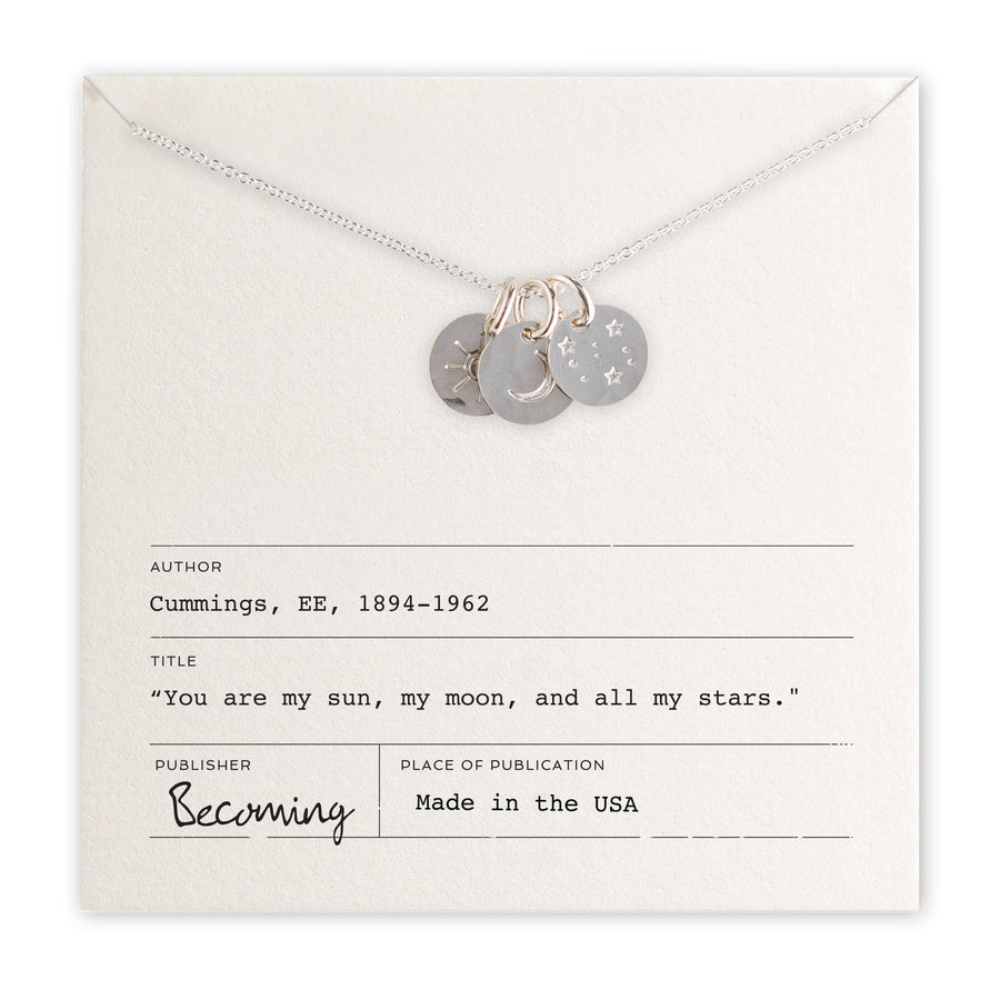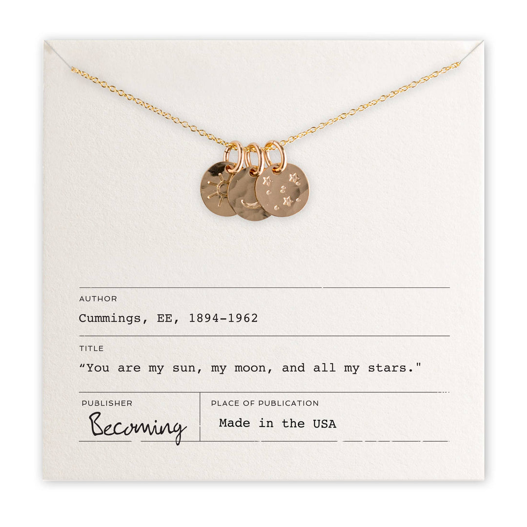 Illuminate your style with the Sun Moon and Stars Necklace. This enchanting piece features delicate charms representing the sun, moon, and stars, each symbolizing love and connection. Measuring 3/8" and suspended on an 18" fine cable chain, it's crafted from either sterling silver or gold filled for a touch of elegance. Thoughtfully packaged with a message necklace card and a beautiful jewelry box, it's the perfect gift for someone special or a delightful treat for yourself. Shine bright and showcase your cosmic charm with this exquisite necklace.