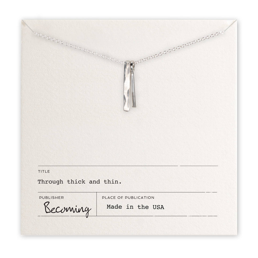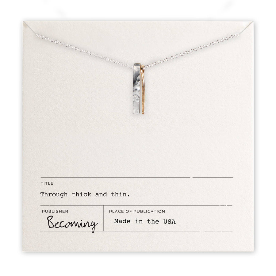 Embrace the journey with the Through Thick & Thin Necklace. This elegant piece features a unique thick and thin bar drop charm, measuring 3/4" long, and hangs delicately from an 18" fine cable chain. Available in silver or a stunning silver and gold mixed metal, it's a perfect reminder of resilience and connection. Each necklace comes beautifully packaged with a message card and jewelry box, making it an ideal gift for loved ones. Celebrate the bonds that weather every storm.