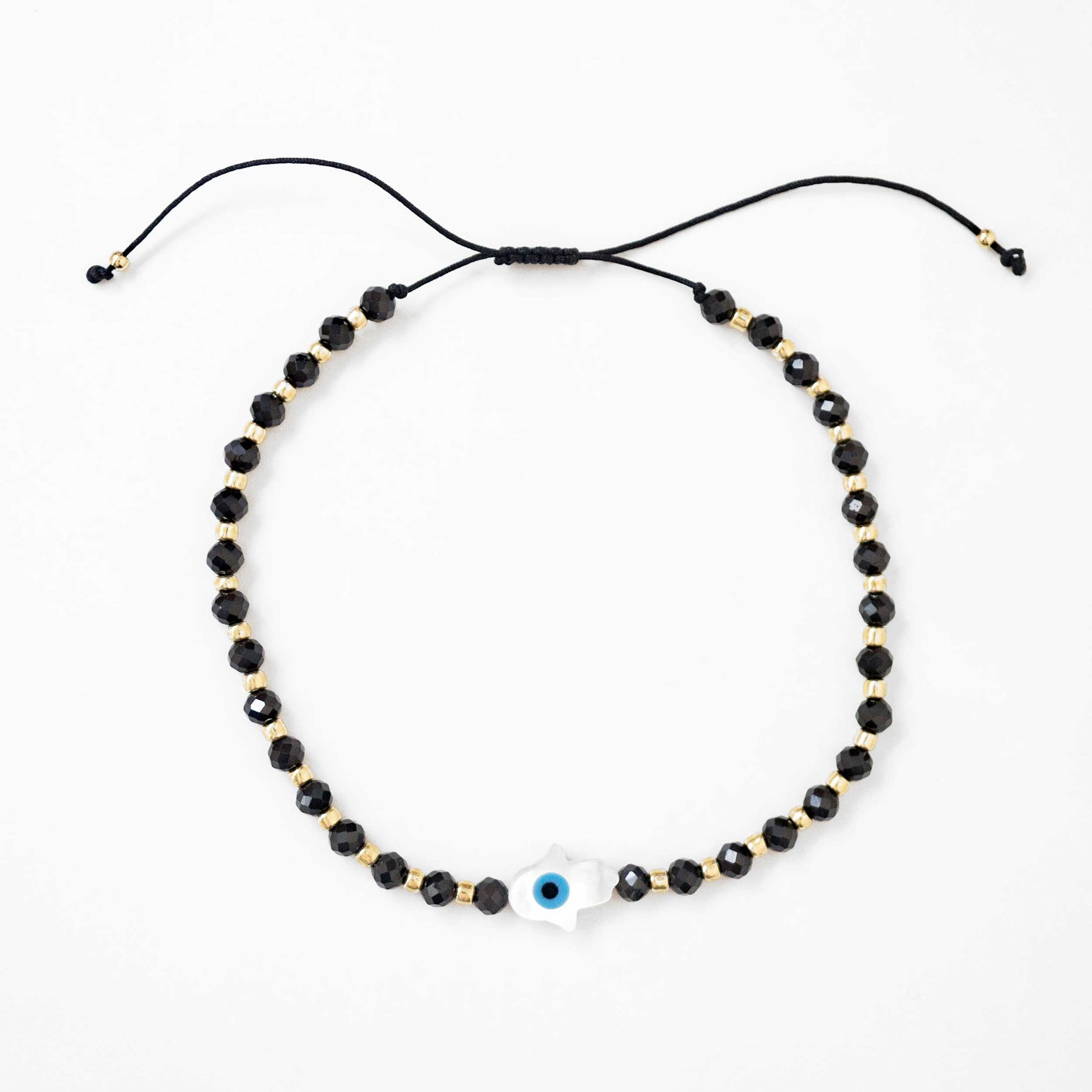 Introducing the Hamsa Gemstone Bracelet in Black Onyx, a striking piece that blends elegance with spiritual symbolism. Handmade with 3mm natural gemstones, each bracelet features unique gemstone colours, ensuring that no two pieces are alike. The adjustable soft cotton cord offers a comfortable fit for all wrist sizes, accommodating 6" to 9". This beautiful bracelet comes elegantly packaged on a gold foil card, making it a perfect gift for yourself or a loved one. Embrace style and protection with this unique accessory.