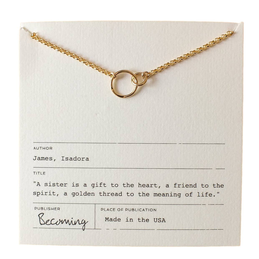 Charm: Large and small joined rings Charm size: 1" across Length: 16" fine cable chain Available metals: Sterling silver, gold filled Packaging: Message card + jewelry box