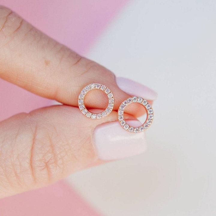 Discover elegance with the Halo Stud Earrings by Chloe + Lois. These dainty pavé circle studs are adorned with sparkling white cubic zirconia stones, beautifully set in sterling silver with a rose gold plating. Measuring approximately 9mm in diameter, they are the perfect understated statement piece. Designed with a friction backing and a nickel-free composition, they ensure both stylish appeal and comfort for everyday wear. Elevate your jewellery collection with these timeless earrings.