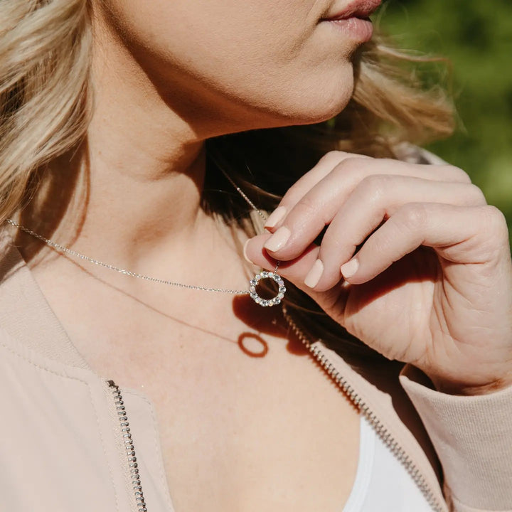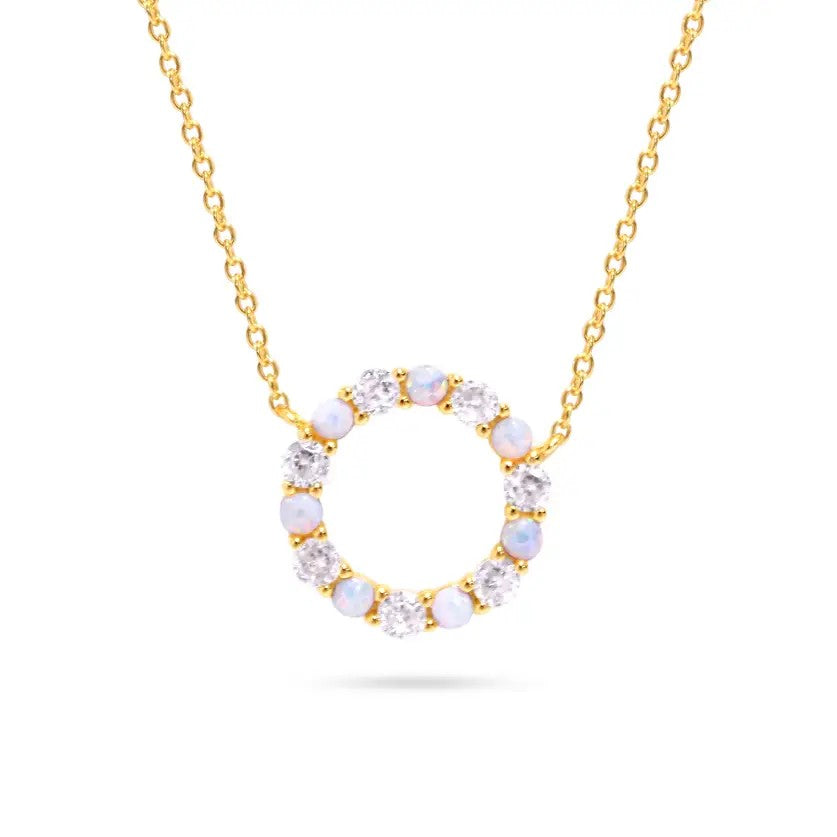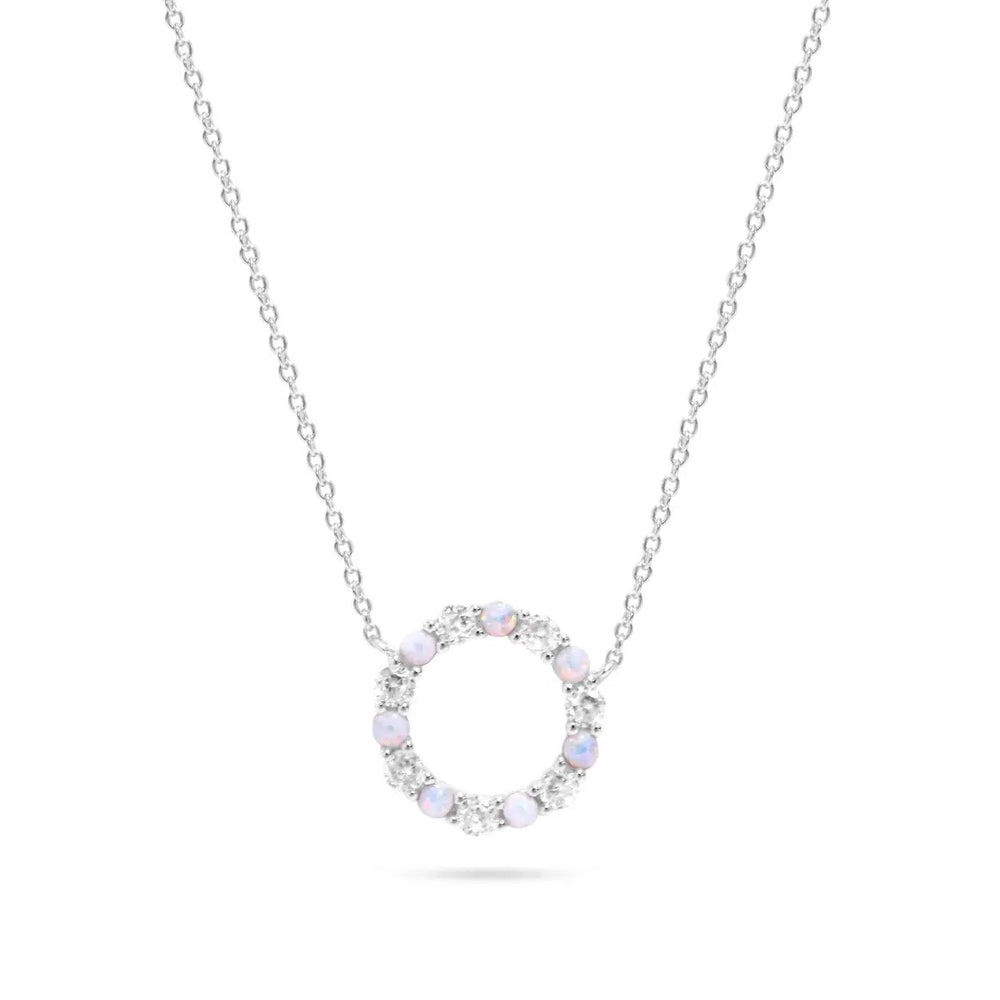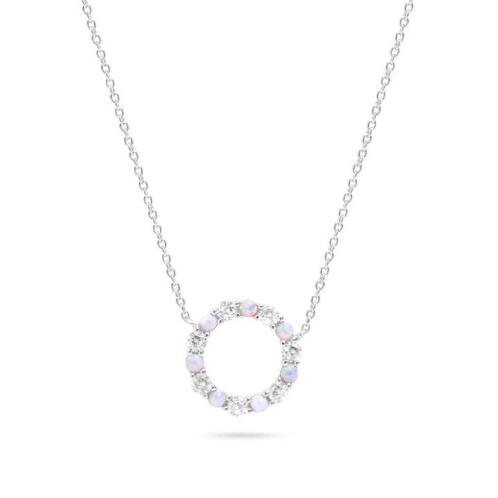 Discover elegance with the Infinity Necklace in White Opal. This stunning piece features 2.3mm prong set white simulated opal and sparkling cubic zirconia stones, exuding a refined charm.