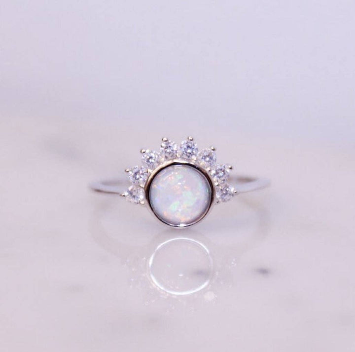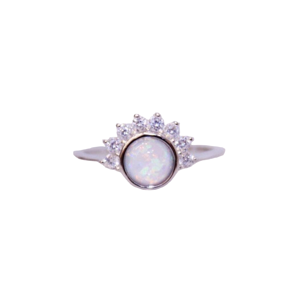 Elevate your style with the Lois Ring in White Opal. Crafted from solid sterling silver or rose gold plated, this exquisite ring features a captivating 6mm simulated white opal center stone, complemented by shimmering 2mm prong-set white cubic zirconia detailing. Perfect for adding a touch of elegance and sophistication to any outfit, this timeless piece is a must-have for your collection.