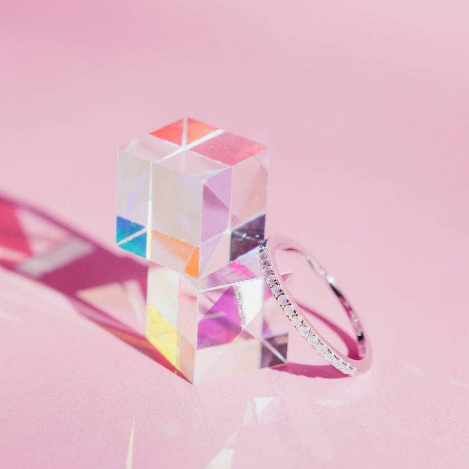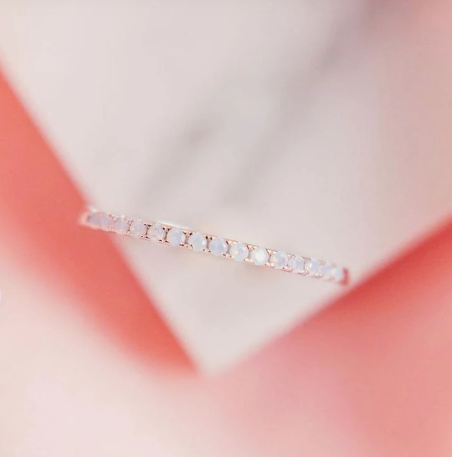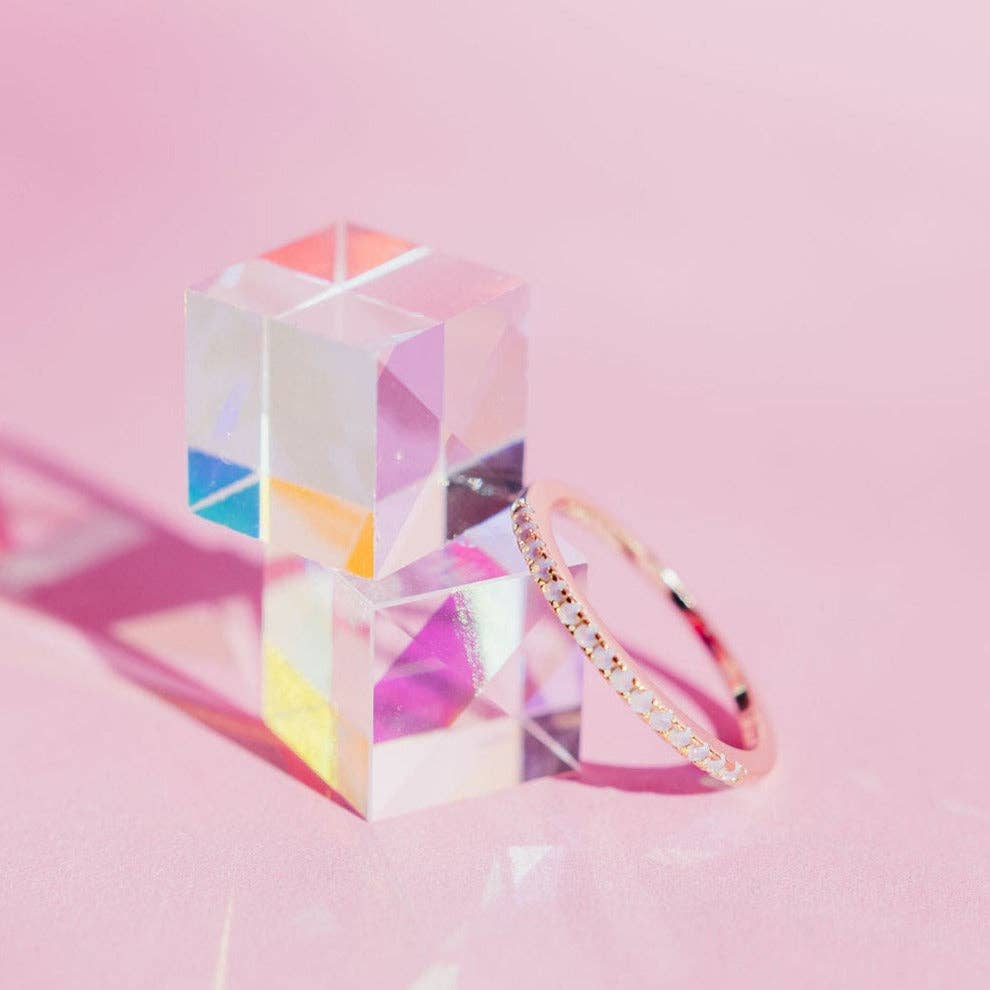 Introducing the Micro Pave Stacking Band in Cotton Candy, a stunning addition to your jewellery collection. This exquisite ring features a solid sterling silver band adorned with 1mm pavé set Cotton Candy Opal stones. Each stone showcases a breathtaking blend of pink hues with a captivating white/purple underglow, ensuring that no two rings are the same.