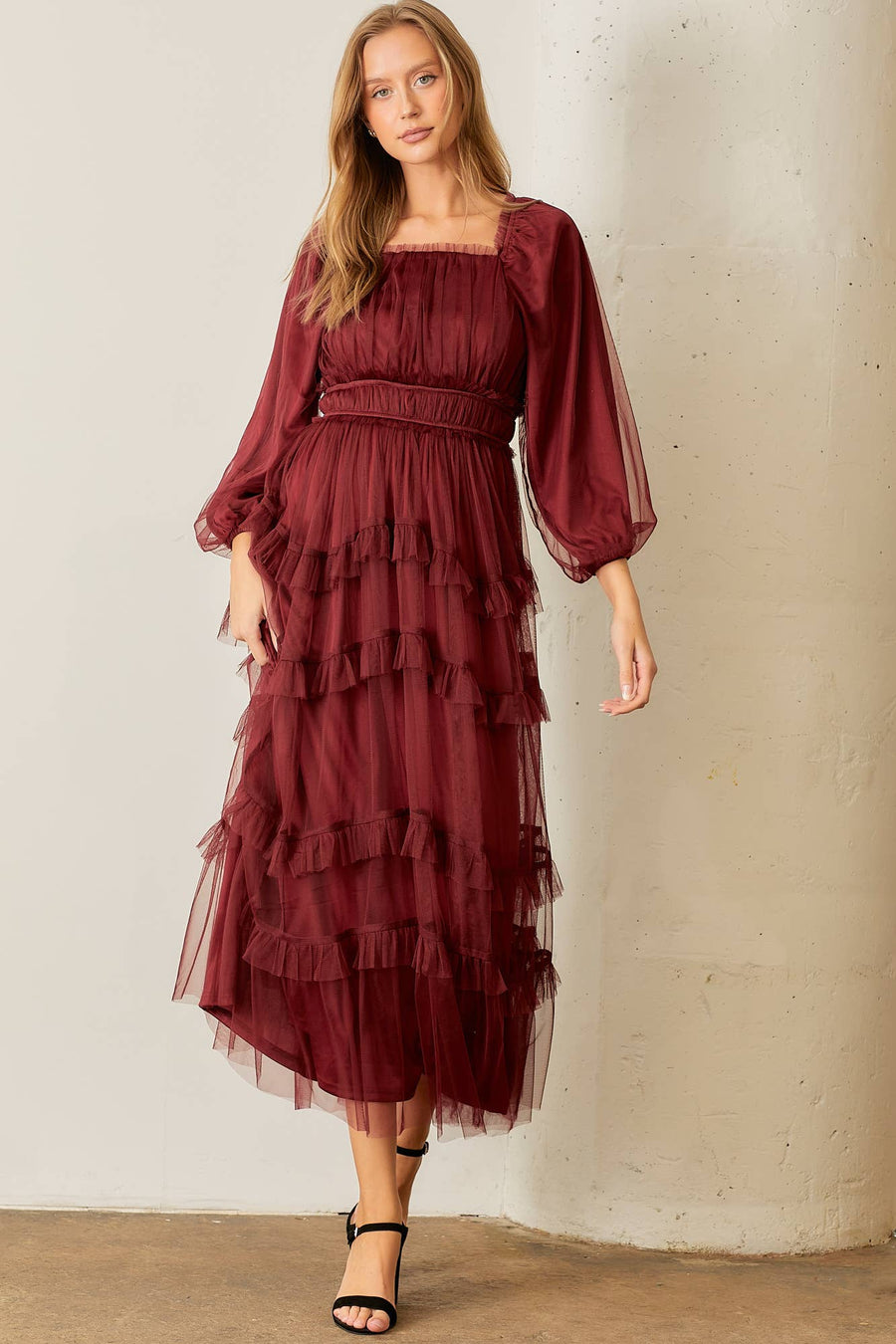 Sheer Ruffle Tiered Tulle Long Sleeve Dress