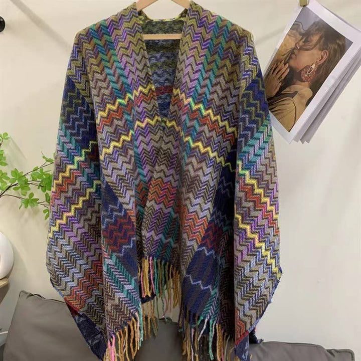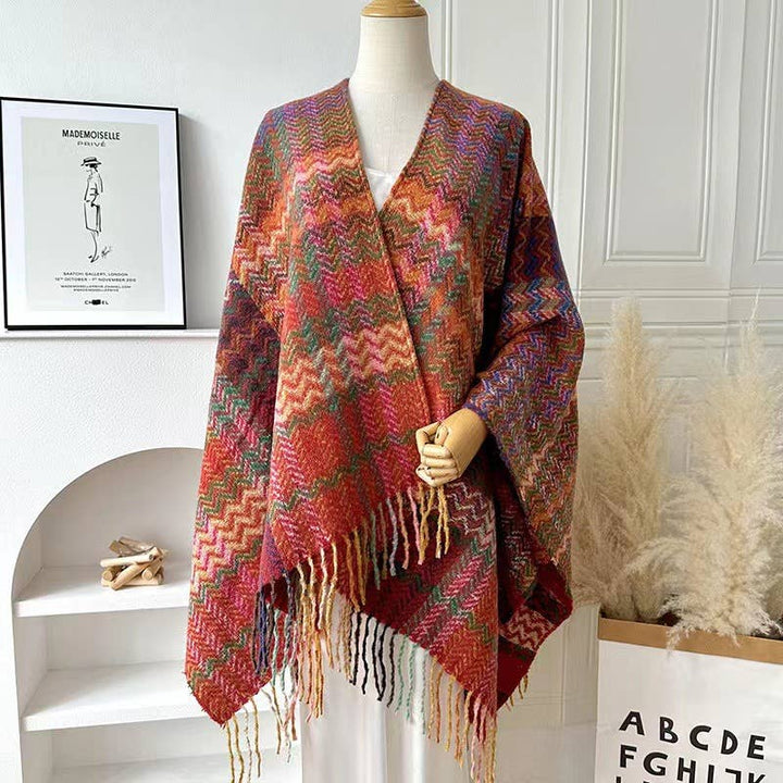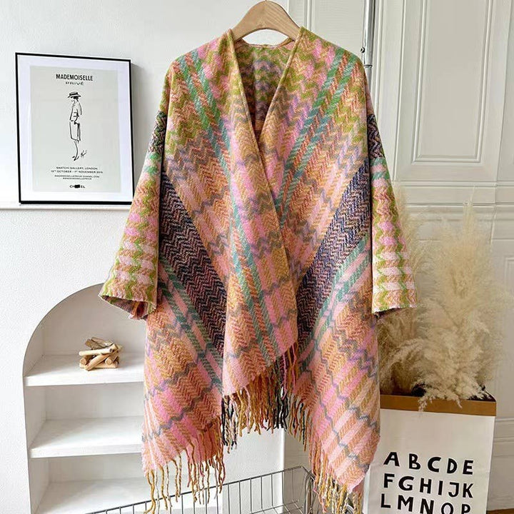 Elevate your wardrobe with the Bohemia Vintage Plaid Thermal Shawl, a versatile piece perfect for any occasion. This chic cape features a stylish plaid design and elegant tassels, offering both comfort and flair.