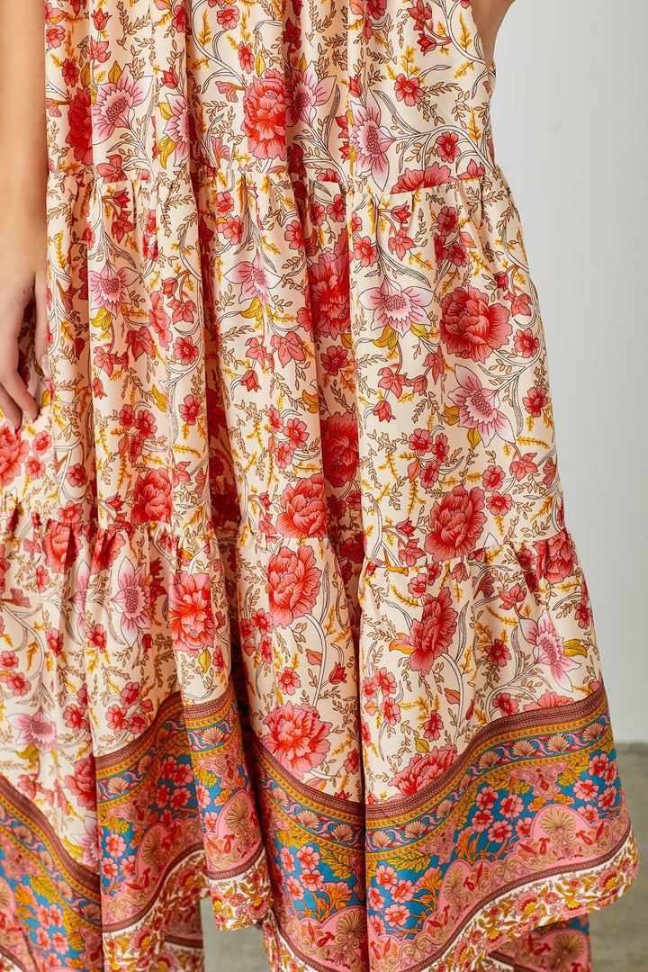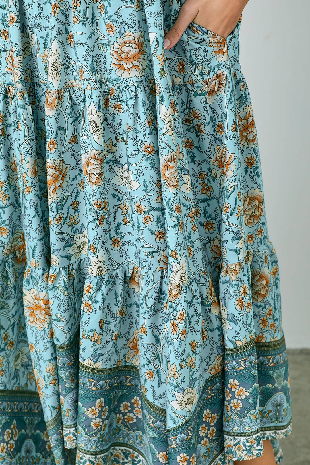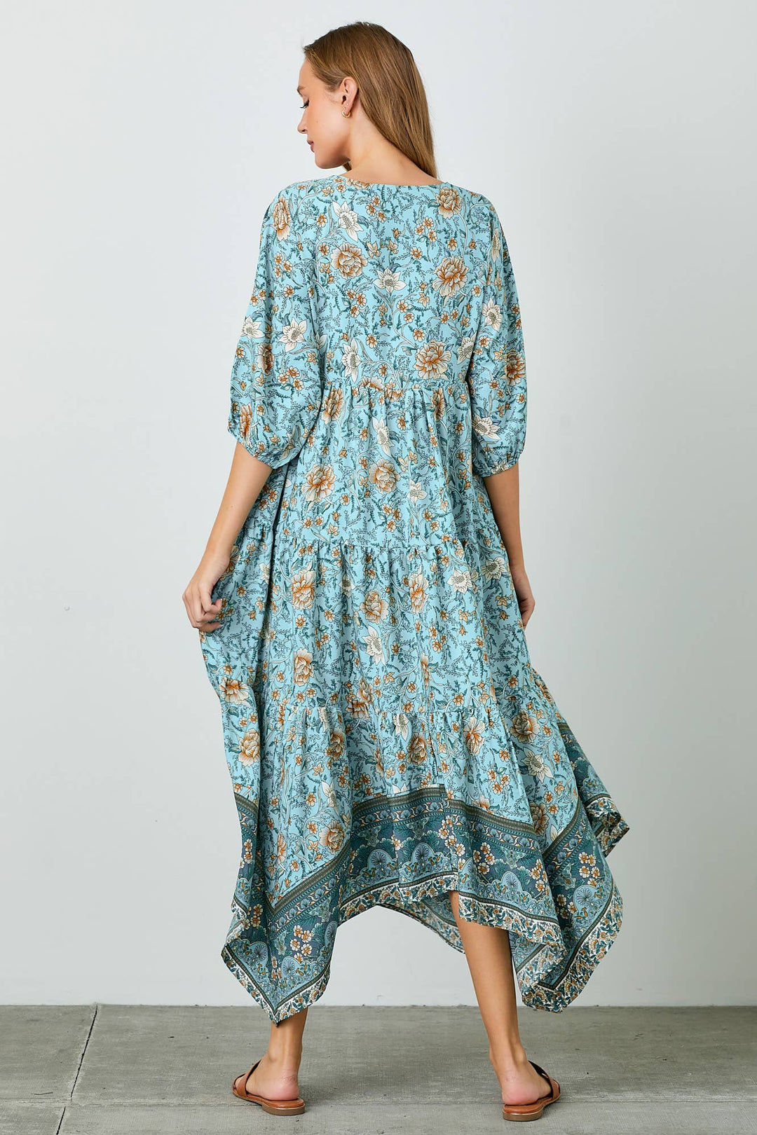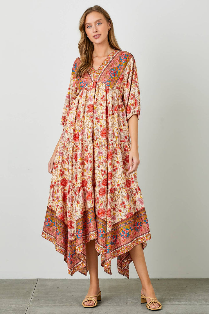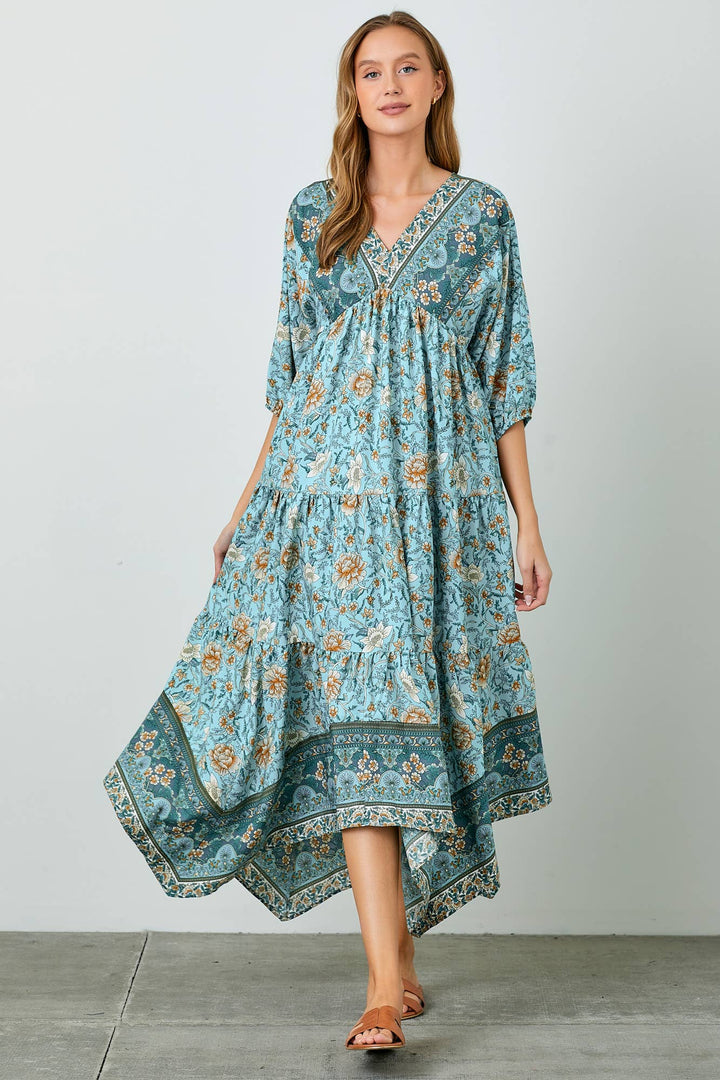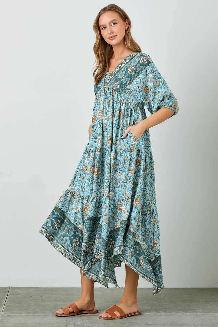 Elevate your wardrobe with the BORDER PRINT TIERED HANKY HEM MAXI DRESS. This stunning piece features an elegant V-neck design, comfortable below elbow sleeves, and practical side pockets for your essentials. The tiered design adds a touch of flair, making it perfect for any occasion. Available in size S, this dress combines style and convenience seamlessly. Make a statement effortlessly with this must-have addition to your collection.
