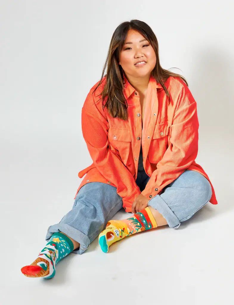 Introducing the Piney & Coco mismatched socks - a festive delight for the holiday season! Featuring Piney the pine tree and Coco the palm tree, this limited edition pair from the Pals Opposocks Collection by artist Nate Bear brings joy and fun.