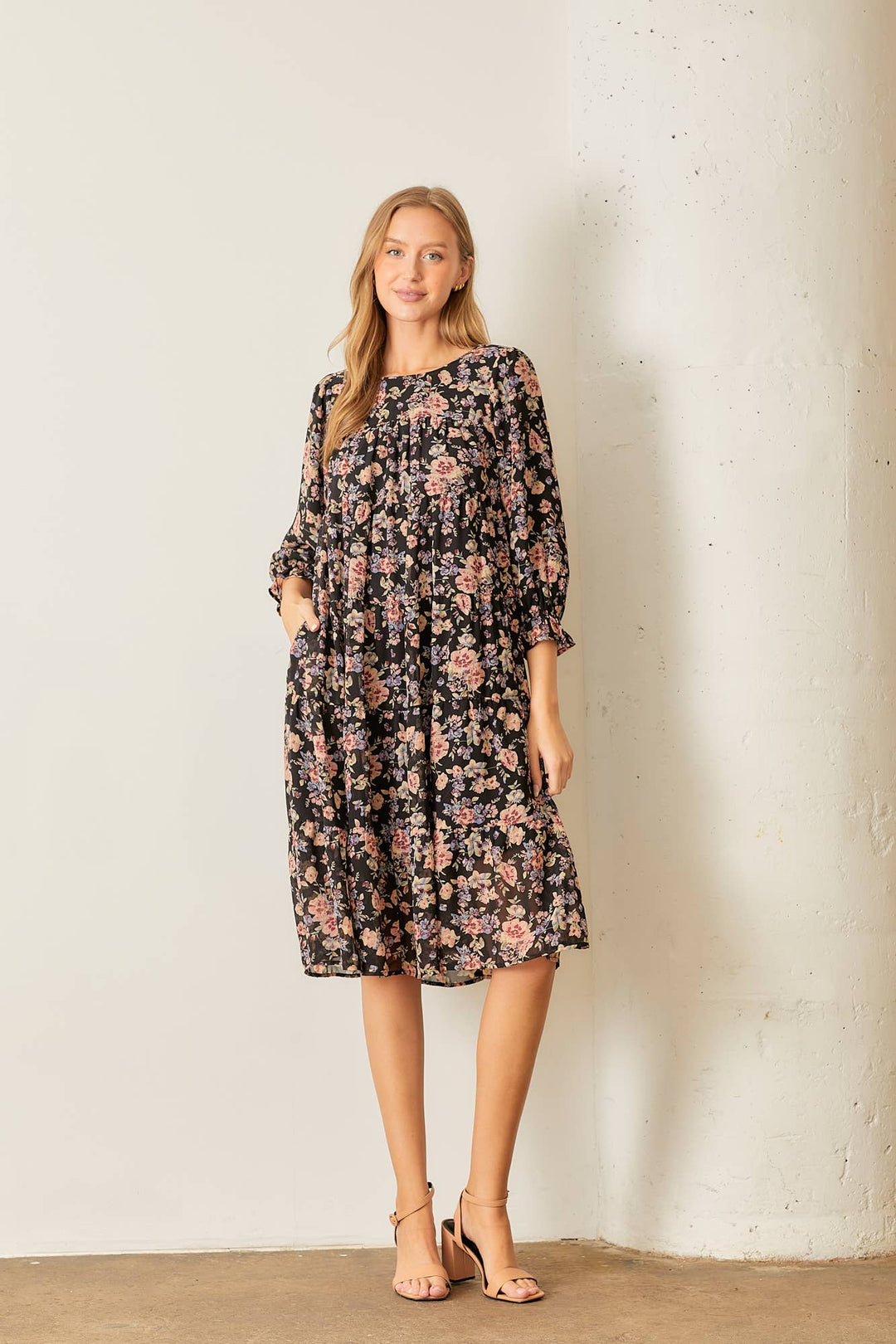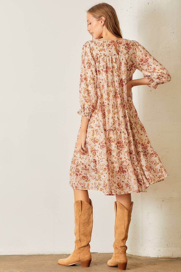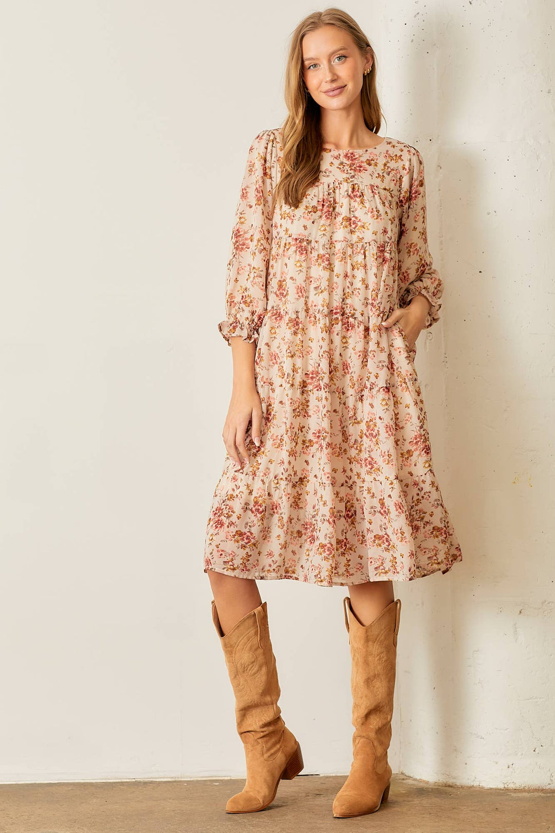 Elevate your wardrobe with our Floral Print Tiered Dress. This cream knee-length beauty features flowy tiers and convenient pockets, offering both style and practicality. The delicate floral print adds a feminine touch, making it a versatile choice for any occasion. Effortlessly chic and comfortable, this dress is a must-have for every fashionista.