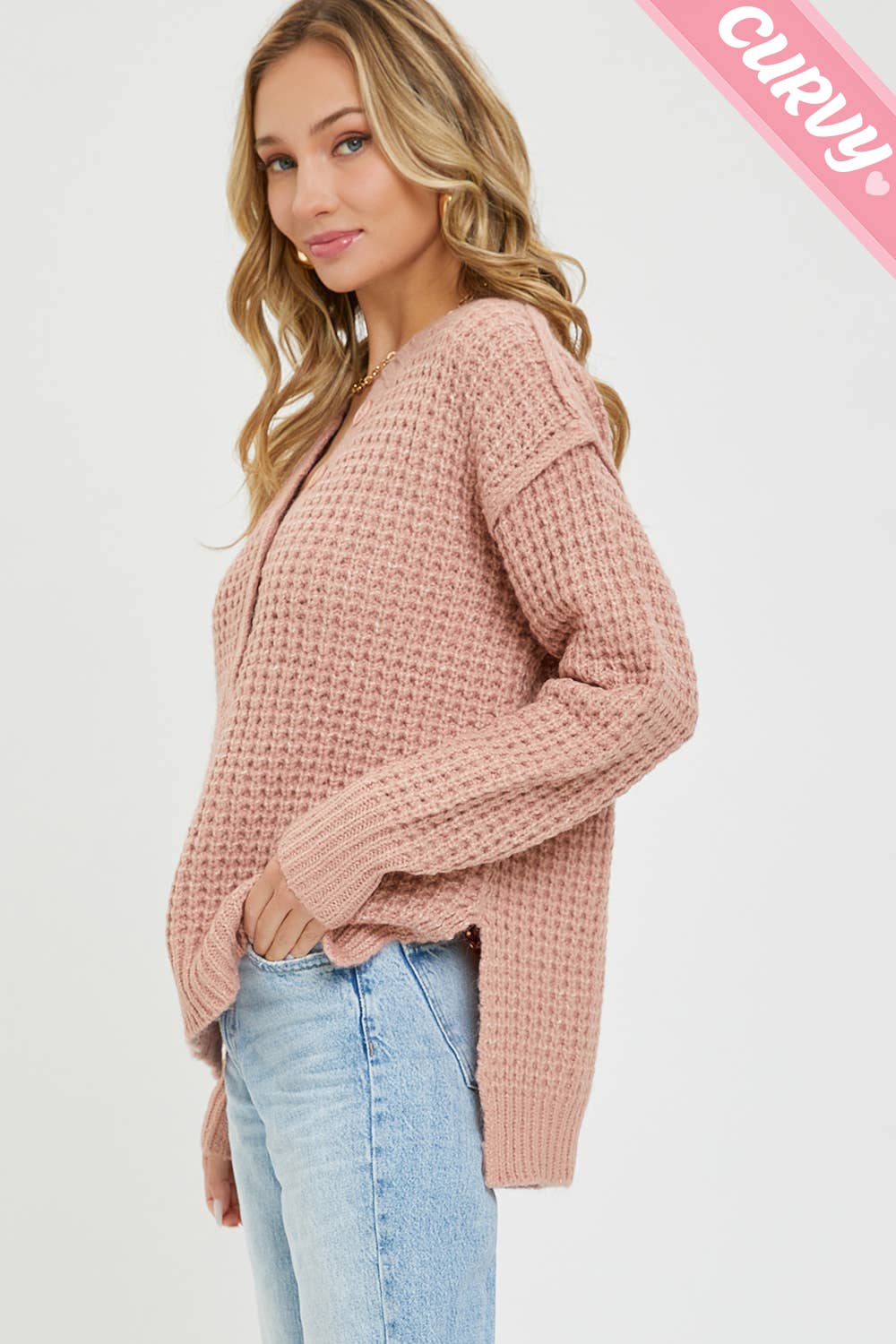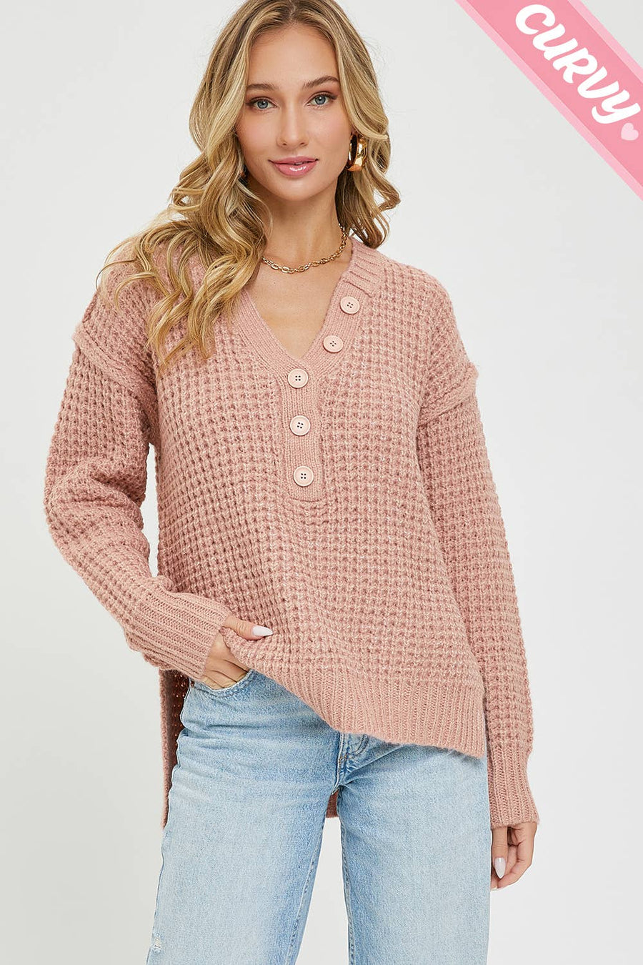 Elevate your winter wardrobe with the Soft Chunky Knit Sweater, designed specifically for plus sizes. This classic waffle knit sweater combines a relaxed fit and dropped shoulders, creating a stylish and comfortable silhouette. Front buttons and long sleeves add a touch of elegance, while the soft, chunky knit fabrication provides ultimate comfort. With side slit details, it's perfect for layering over jeans or leggings. A timeless addition that every closet needs.