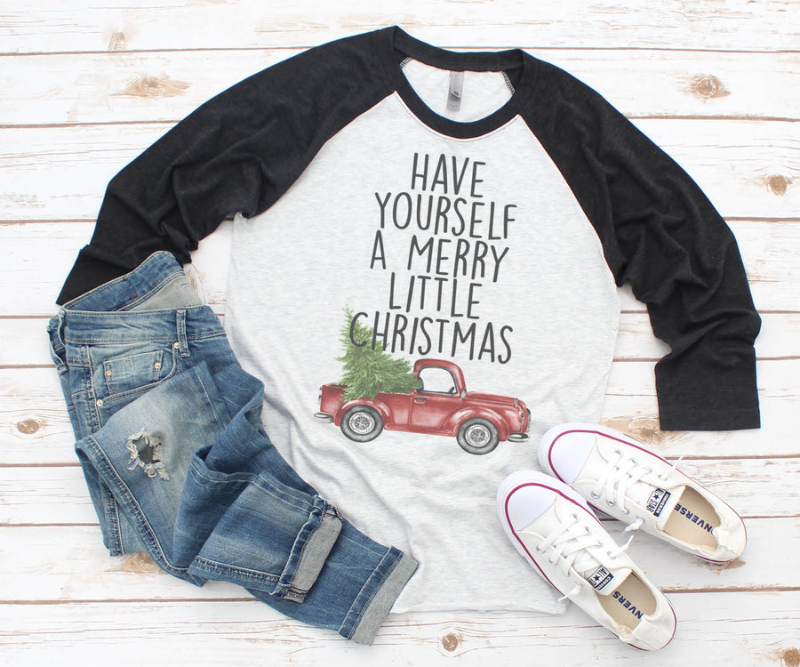Embrace the holiday spirit with our Red Truck Raglan Tee. Adorned with a classic red truck carrying a festive Christmas tree, this shirt is designed to spread cheer wherever you go. The comfortable raglan style and the heartwarming message "Have yourself a Merry Little Christmas" make it a delightful choice for any holiday gathering. Available in sizes Small to 3XL, it's the perfect addition to your festive wardrobe.