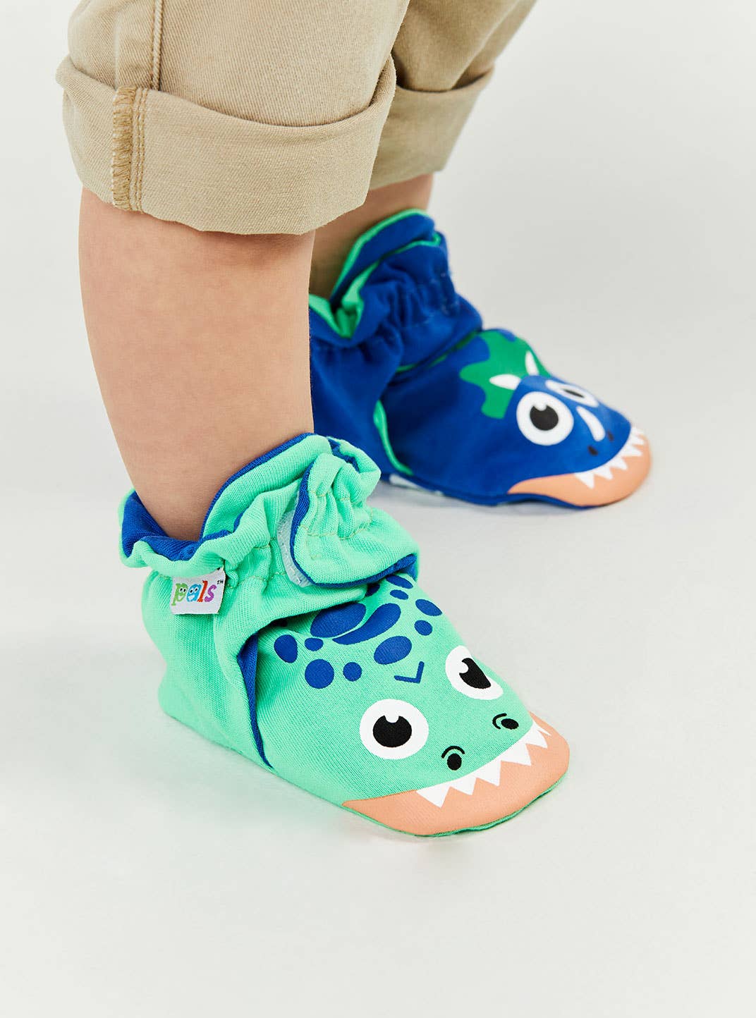 Introducing the T-Rex & Triceratops Dinosaurs Non-Slip Baby Booties, the ideal gift for little ones. Crafted from 100% soft breathable cotton, these booties ensure comfort and safety with non-slip grips and a gentle Velcro strap for a secure fit, eliminating choking hazards. Designed to fit babies aged 6-18 months, they are also easy to clean and machine washable. Perfect for baby showers or first birthdays, these mismatched booties are sure to be a hit and will quickly become a bestselling item in your store. Start your tiny human off on the right foot today!