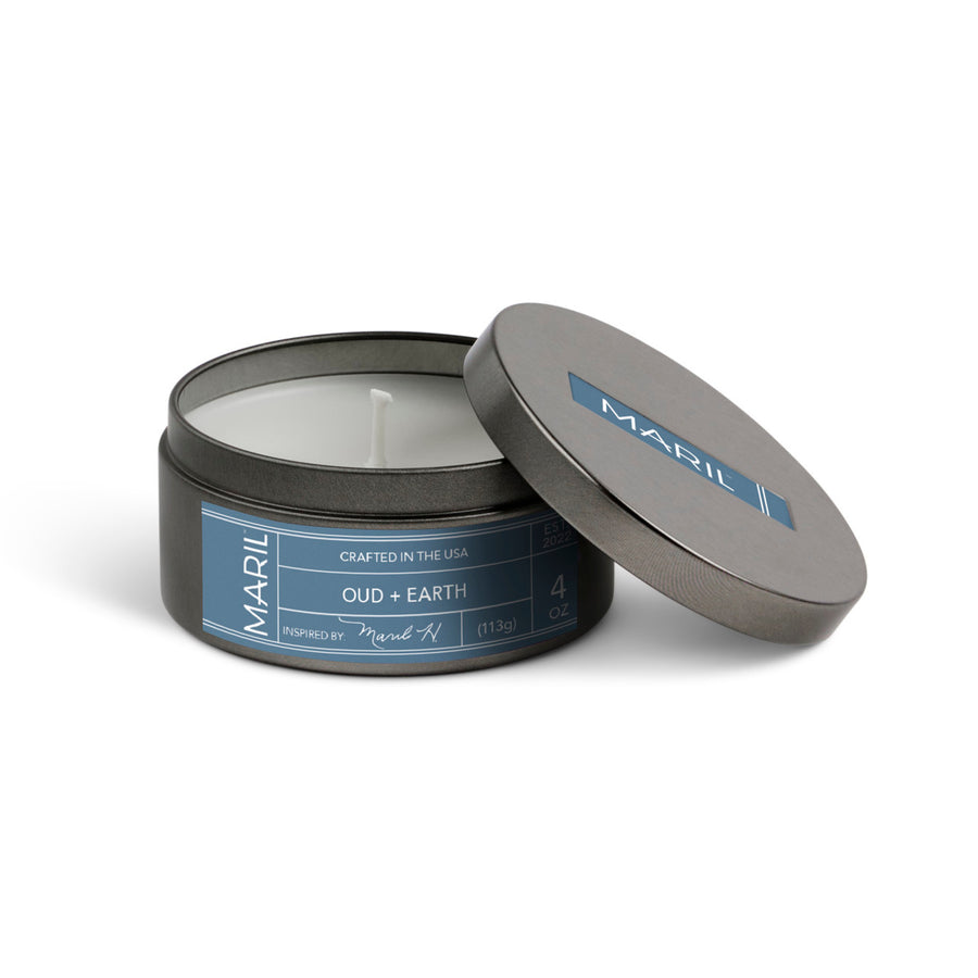 Experience the ultimate sensory journey with the Oud + Earth 4 oz. Travel Candle by MARIL. Crafted from a soy wax blend and featuring a chic tin design, this candle blends fresh marine notes with grounding oud wood, patchouli, and delicate florals.
