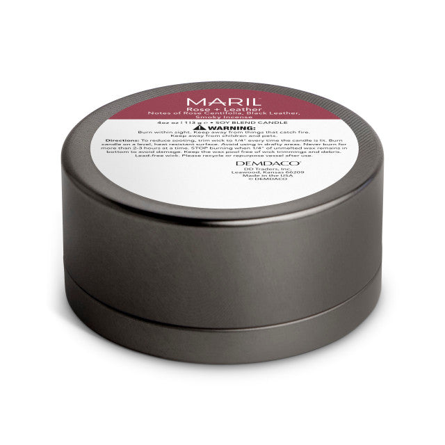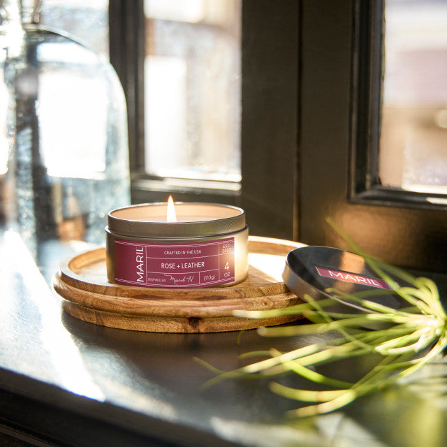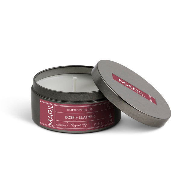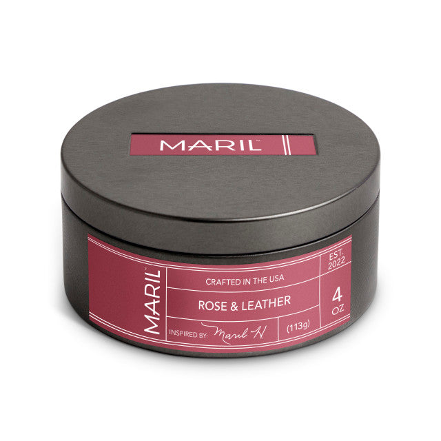 Transform your living space into a sanctuary with the Rose + Leather 4 oz. Travel Candle by MARIL. This exquisite candle is crafted from a luxurious soy wax blend and releases an enchanting fragrance that combines the timeless essence of roses with a modern twist of smoky oud and incense. Experience the captivating notes of sweet peony dew, black rose, and desert patchouli, creating an immersive sensory experience that refreshes your soul.