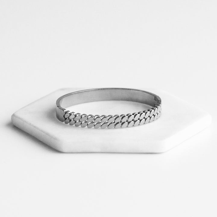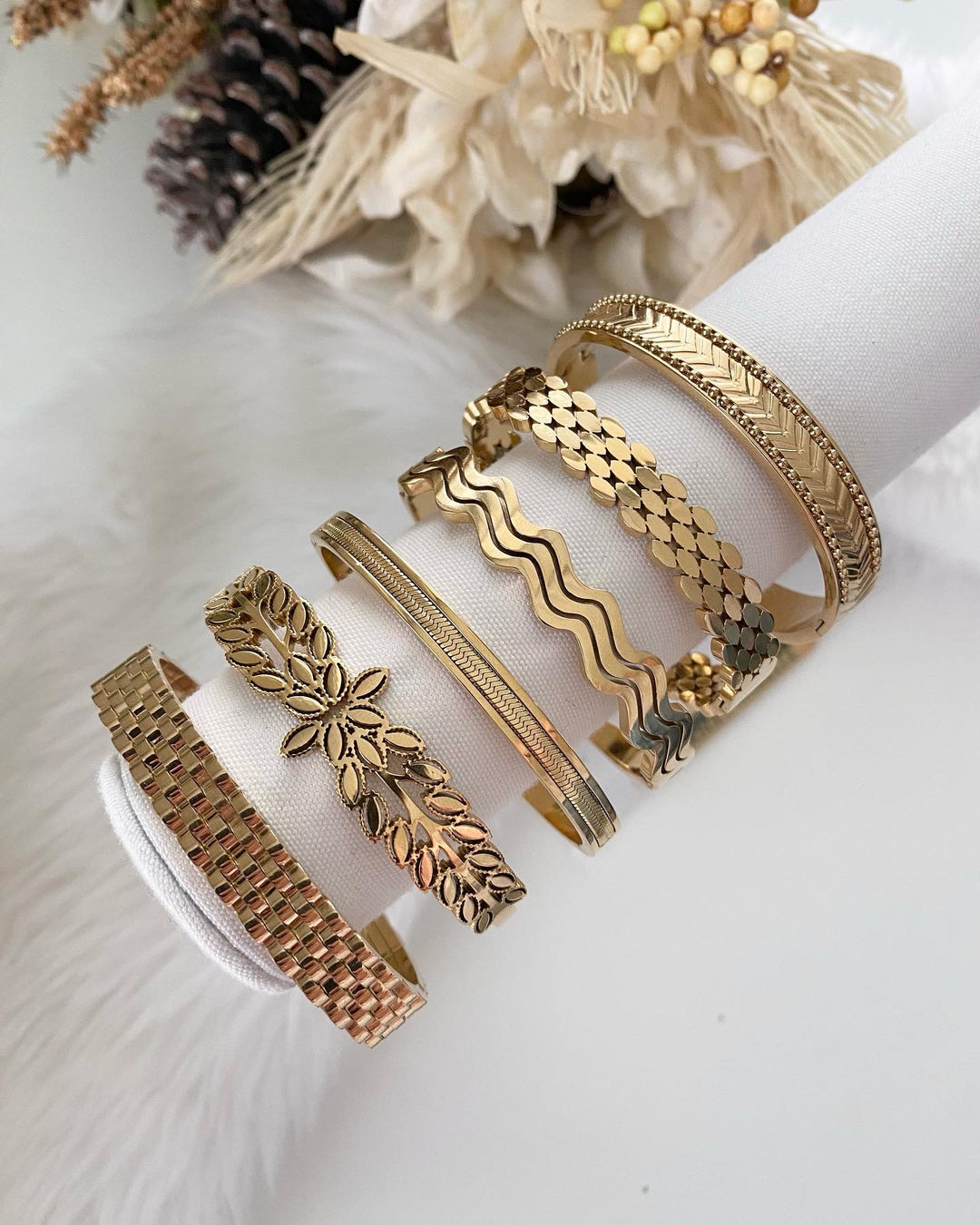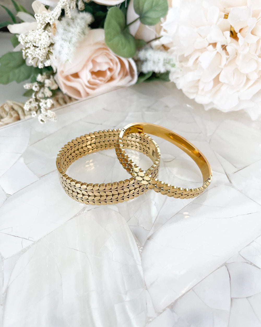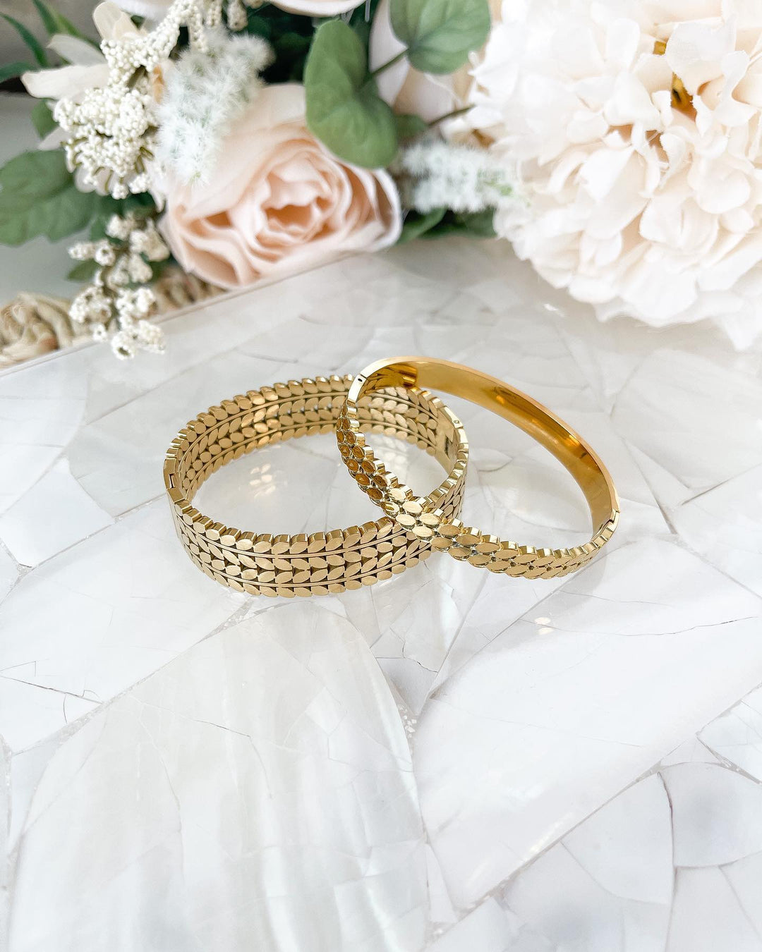Introducing the Aya Bracelet, a stunning accessory that combines elegance and style. Crafted with geometric shapes on a silver or 14K ion plated stainless steel cuff, this bracelet is both hypoallergenic and adjustable from 6.25 to 7.25 inches, making it ideal for those with sensitive skin. Elevate your collection with the Aya Bracelet – a perfect blend of versatility and sophistication.