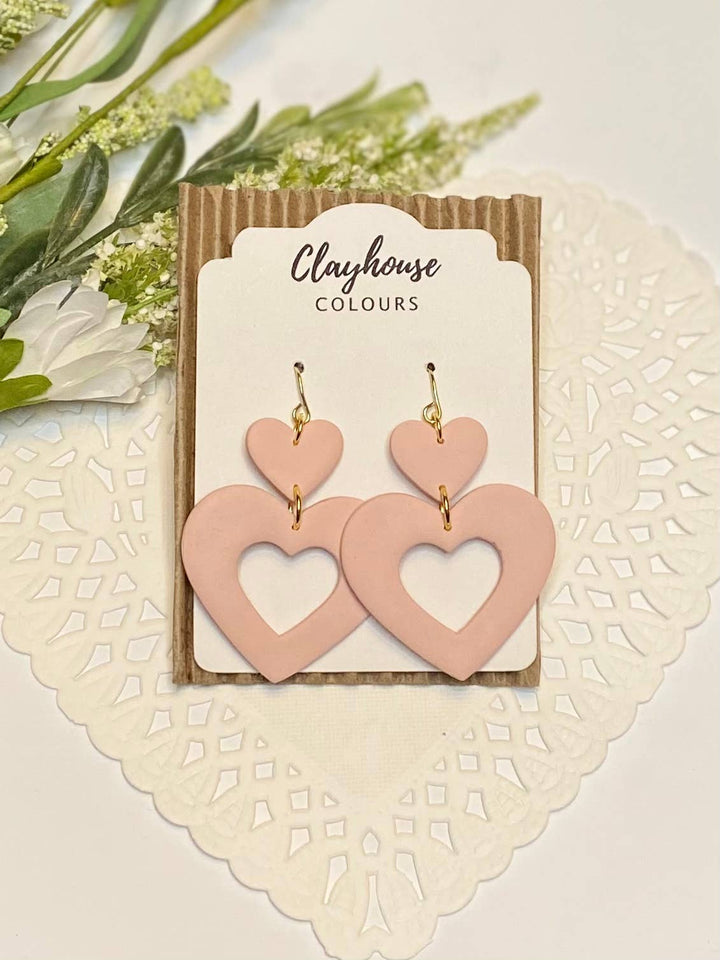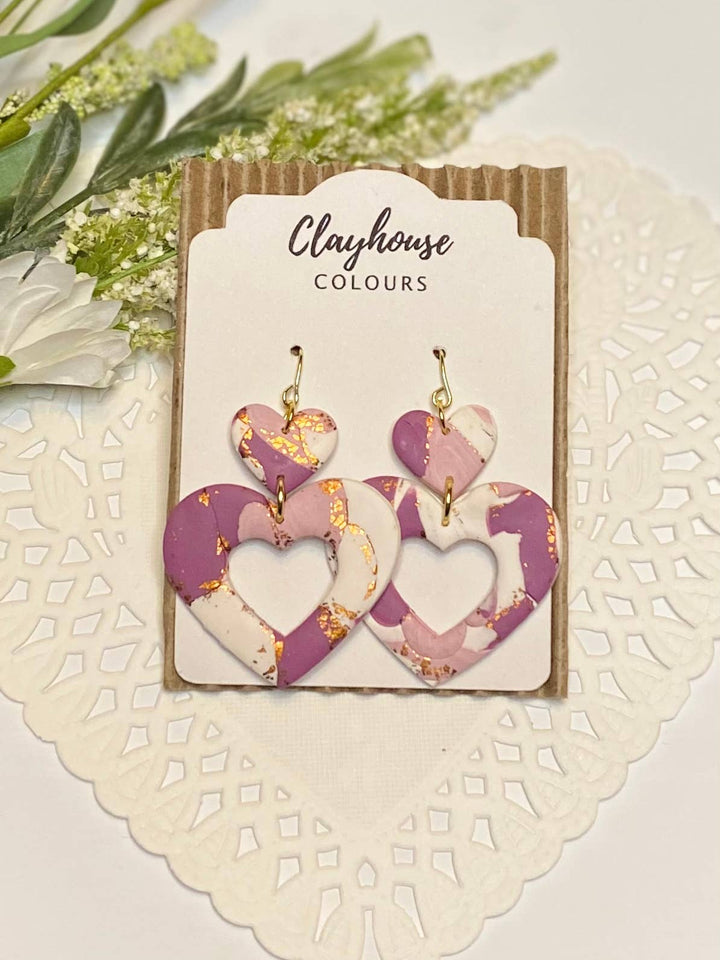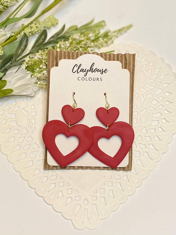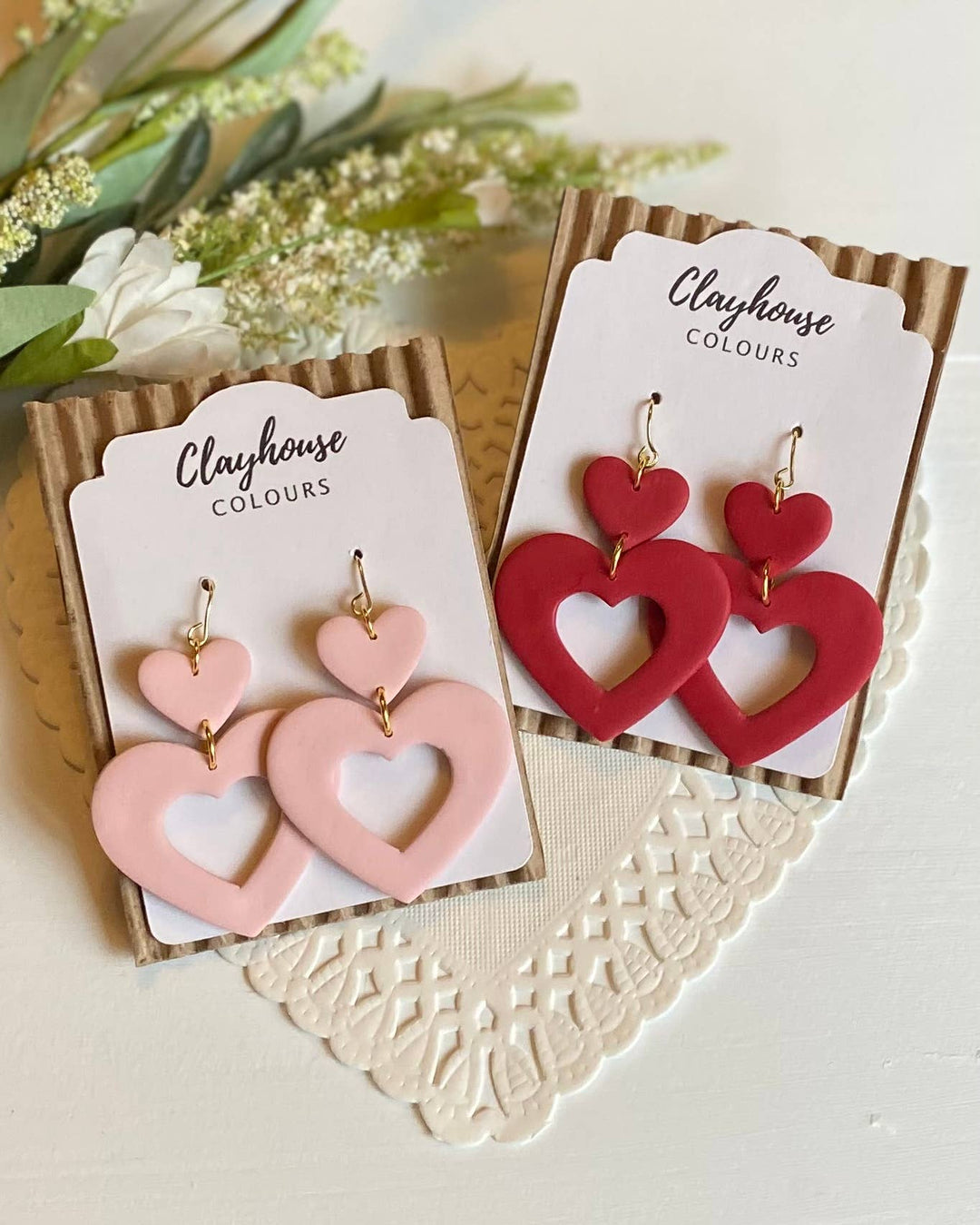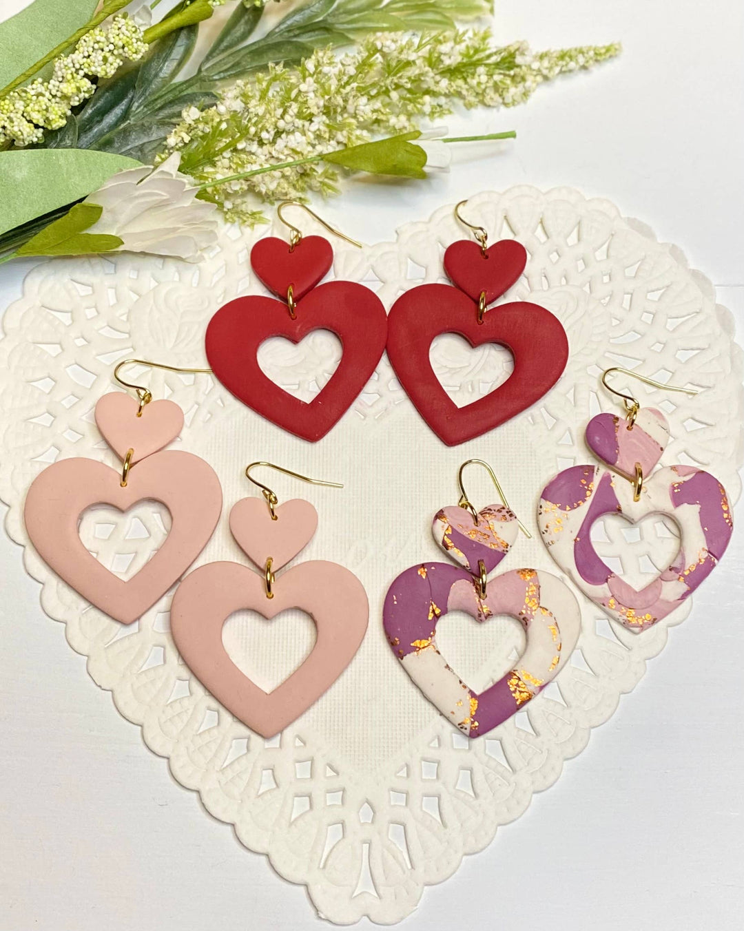 Introducing Heart Dangles Clay Earrings – a unique pair of handmade polymer clay statement earrings. Carefully crafted in small batches, these earrings are not only beautiful but also incredibly comfortable, making them feel weightless throughout the day.
