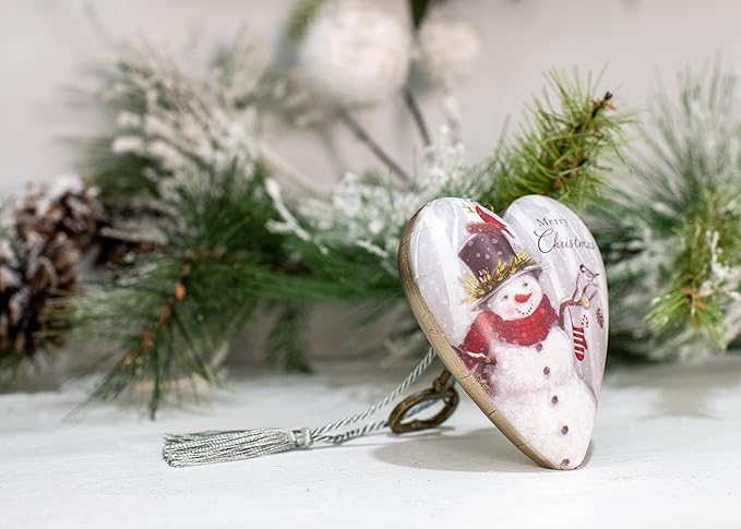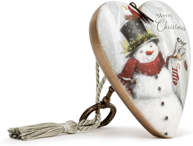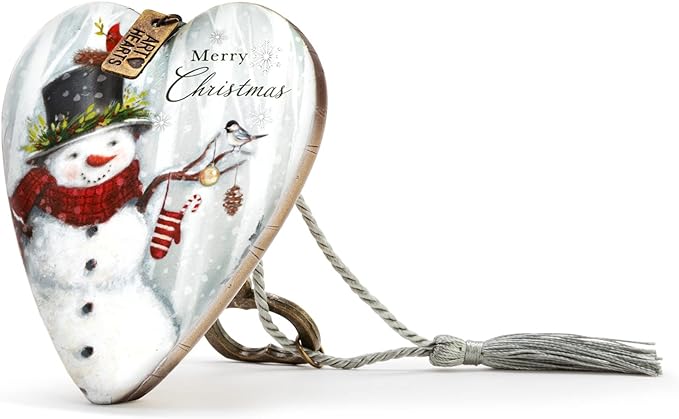 Introduce the Merry Christmas Snowman Art Heart to your holiday décor. This charming piece features a winter white design showcasing a snowman with the heartfelt message "Merry Christmas."