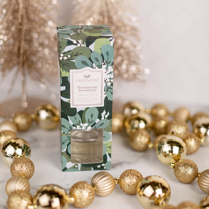 Transform your space with the Reed Diffuser in Shimmering Snowberry. This fresh and clean fragrance, beautifully crafted by professional perfumers, combines tart grapefruit, apple, and kiwi with sweet jasmine and lily for a modern aromatic experience.