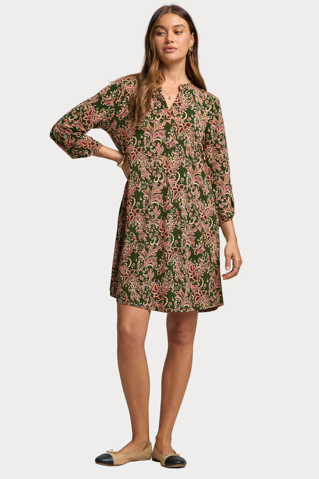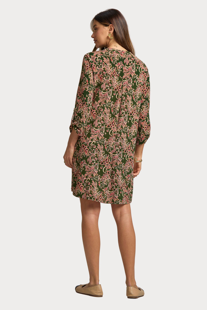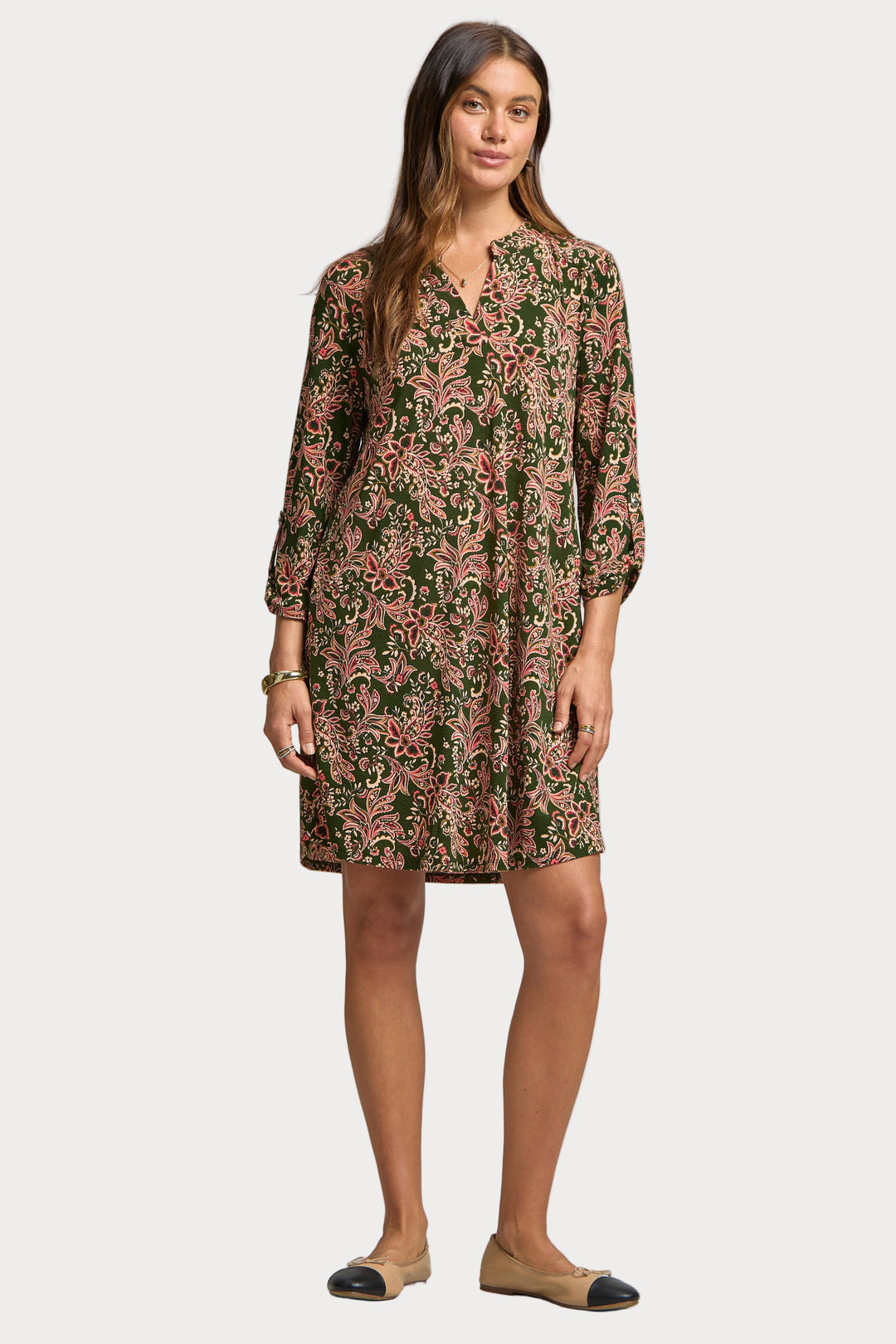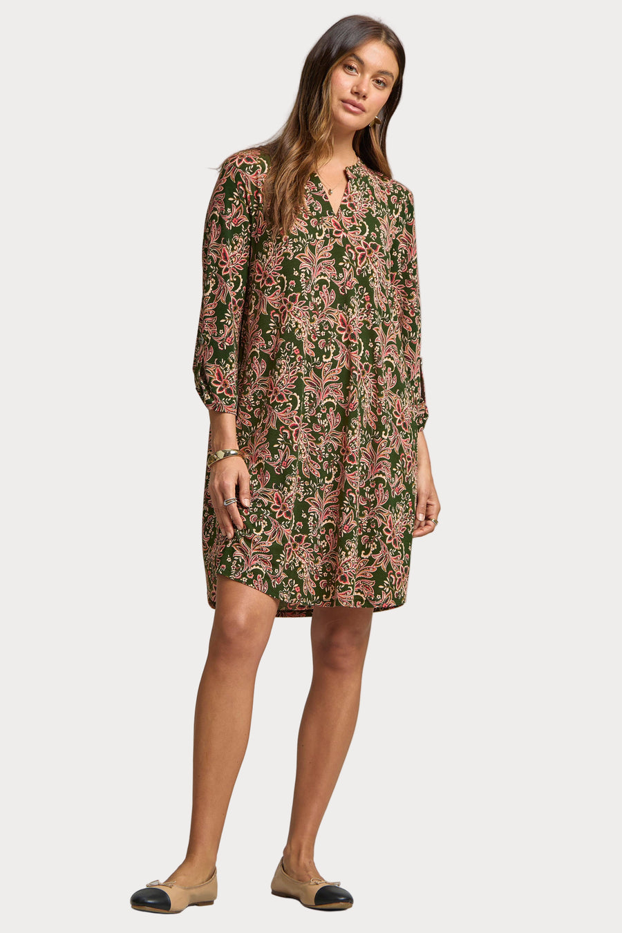 Effortless style meets all-day comfort. Our A-line dress features a stunning olive green paisley print, a flattering V-neck, 3/4 sleeves, and convenient side pockets. The perfect versatile piece for your wardrobe.