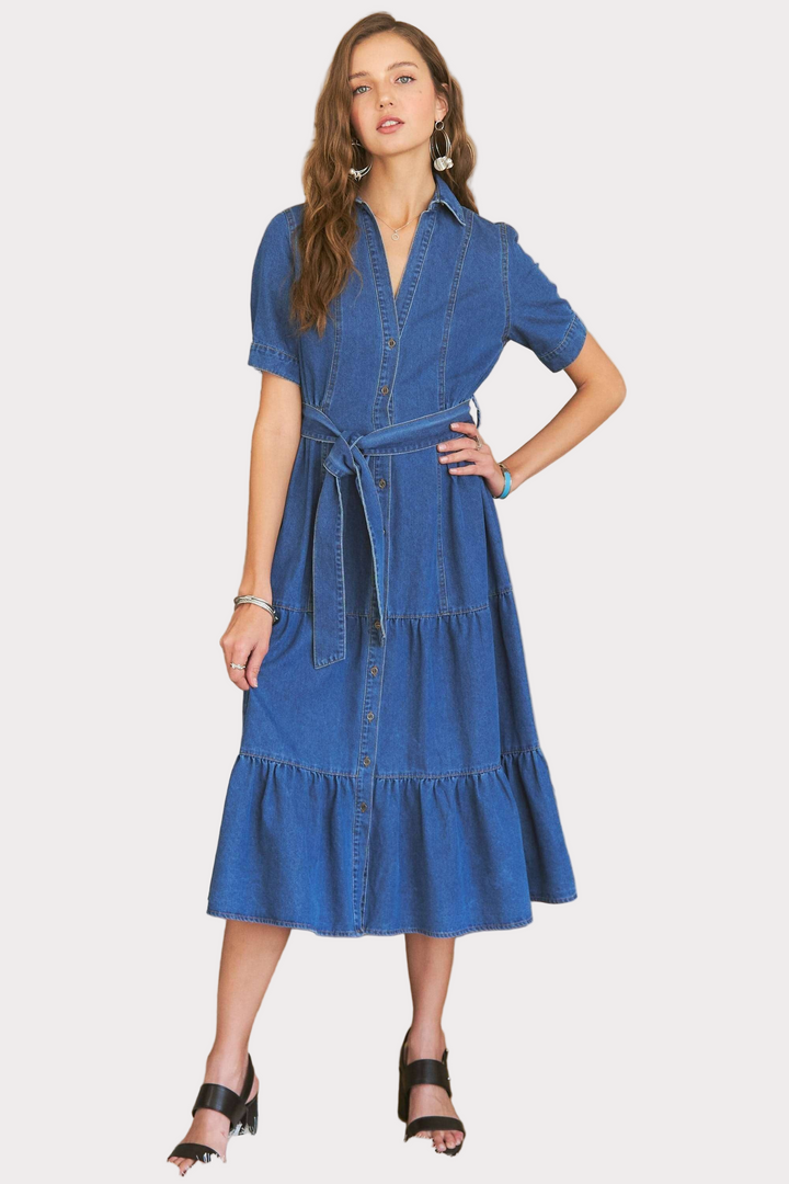The Harper Belted Denim Midi Dress | Casual & Classic dress styled in a boho layering look