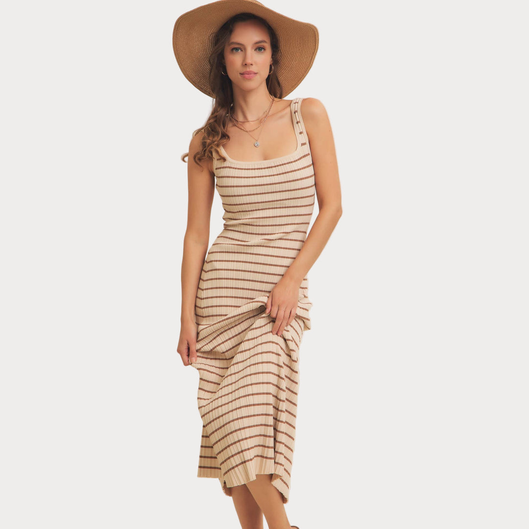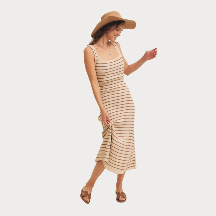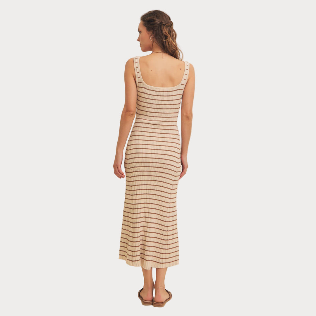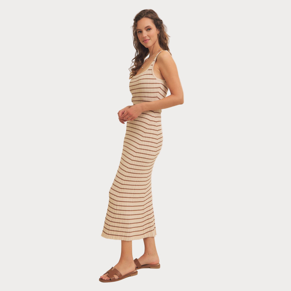 Striped Ribbed Knit Dress | Cream & Brown Midi Sweater Dress
